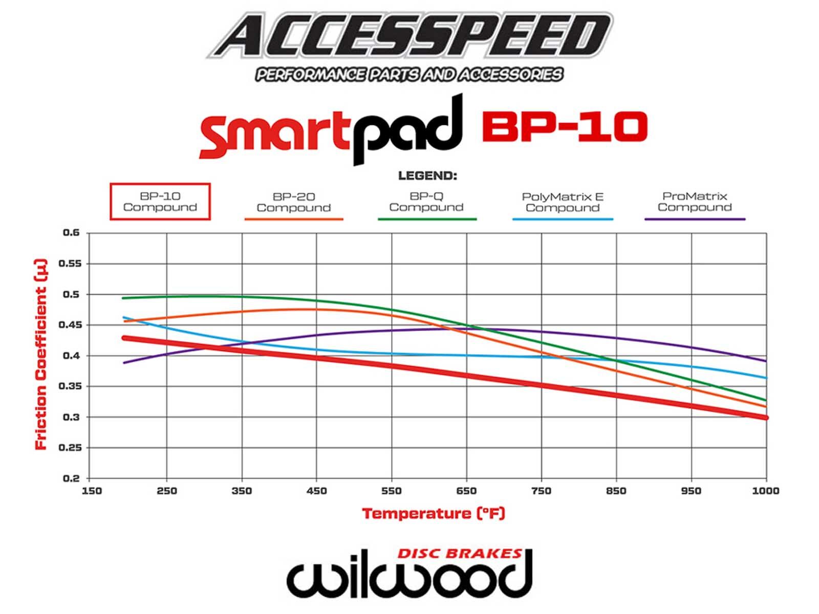 Wilwood BP compound SmartPad numbered series represents the latest compounds developed through Wilwood research. Used by top racers in all auto racing genres, they also come standard in most kits for street use. Four different formulas offer increasingly aggressive friction and tolerance to high temperature, from spirited street use to extremely demanding racing competition. Multiple friction options allow users to optimize brake response to track conditions and weather. Compatible with all iron, steel, stainless, and titanium rotors within their intended temperature ranges.