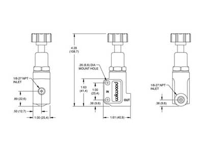 The new generation of adjustable proportioning valves combines the latest refinements to deliver precise pressure metering and strength from a compact forged billet design. Pressure adjustments range from 150-1200 PSI and provide for a maximum decrease of 57% in line pressure, the most of any available valve. Adjuster knob with fine thread tuning provides precise pressure adjustment. Valves weigh only 5.2 ounces and have two .25” side mounting holes spaced 1.00” apart. Inlet / outlet ports are 1/8-27 NPT and valves are supplied with two 1/8-27 NPT to 3/8-24 inverted flare female fittings that will fit most domestic 3/16th hard brake lines.