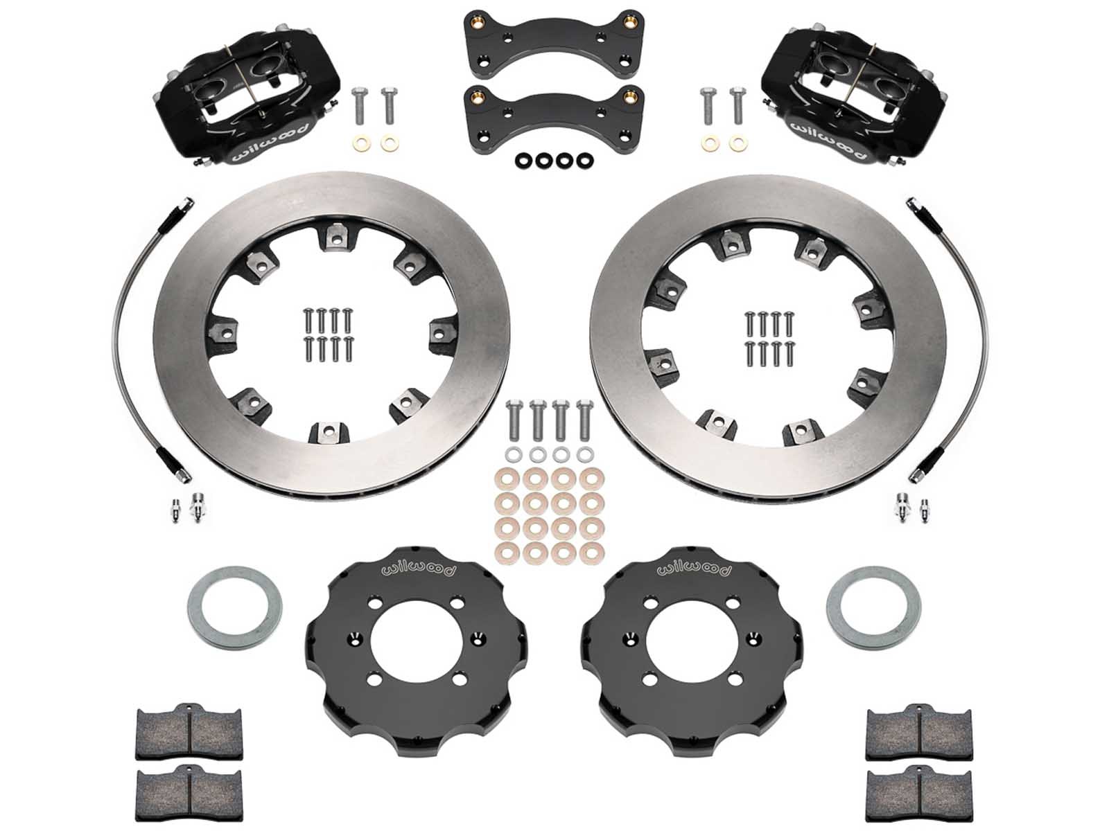 Wilwood Forged Dynalite Pro Series big brake kits from Accesspeed provide high performance, big brake stopping power by combining modern brake technology with high-tech styling to update the brakes on your compact sport vehicle. The OE calipers and rotors are replaced with forged aluminum, four-piston calipers mounted over larger diameter, certified alloy 30-vane 11.75-inch vented iron rotors. The new two-piece rotor assemblies provide weight-saving forged aluminum mounting hats. The calipers feature an increase in effective piston volume to deliver higher clamping power with less pedal effort than stock. The thicker, vented rotor design adds cooling efficiency and durability to extend service life. BP-series SmartPads add high-response with increased resistance to fade and longer wear over typical OE replacement pads. Options for caliper colors and rotor styles are available to personalize the look on any car. For on-track driving enthusiasts, additional track-only fortifications are available on a custom order basis by contacting the technical staff at the factory. Braided stainless steel Flexlines are included in this kit.