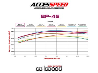 Wilwood BP compound SmartPad series represents the latest compounds developed through Wilwood research. Used by top racers in all auto racing genres, they also come standard in most kits for street use. Four different formulas offer increasingly aggressive friction and tolerance to high temperature, from spirited street use to extremely demanding racing competition. Multiple friction options allow users to optimize brake response to track conditions and weather. Compatible with all iron, steel, stainless, and titanium rotors within their intended temperature ranges. Wilwood’s latest compound, the BP-45, is a very high friction pad formulated to provide smooth friction throughout the entire temperature curve with high torque control, providing drivers with a consistent and accurate pedal feel during heat cycles. For use on iron or steel rotors in all types of race vehicles.