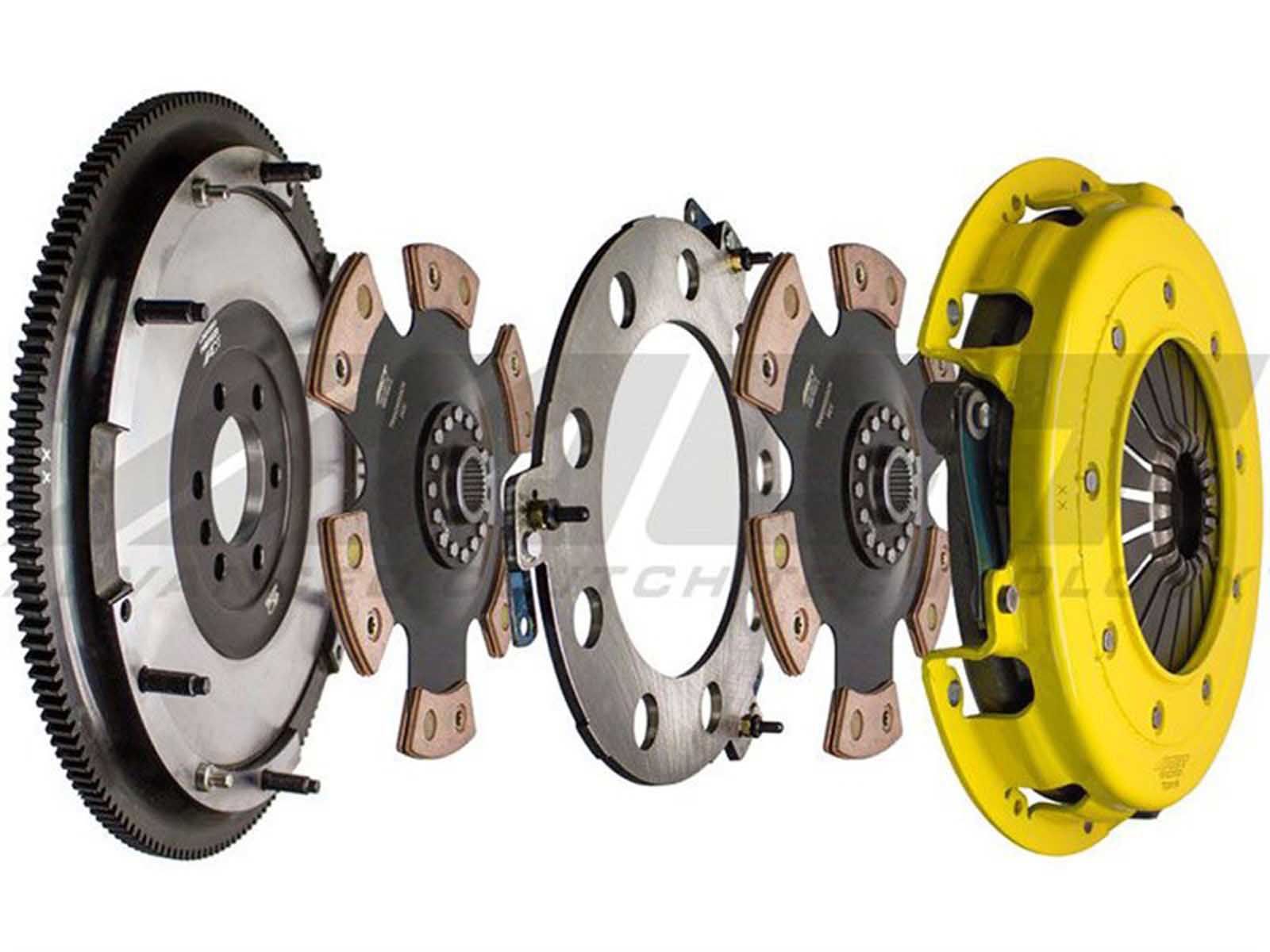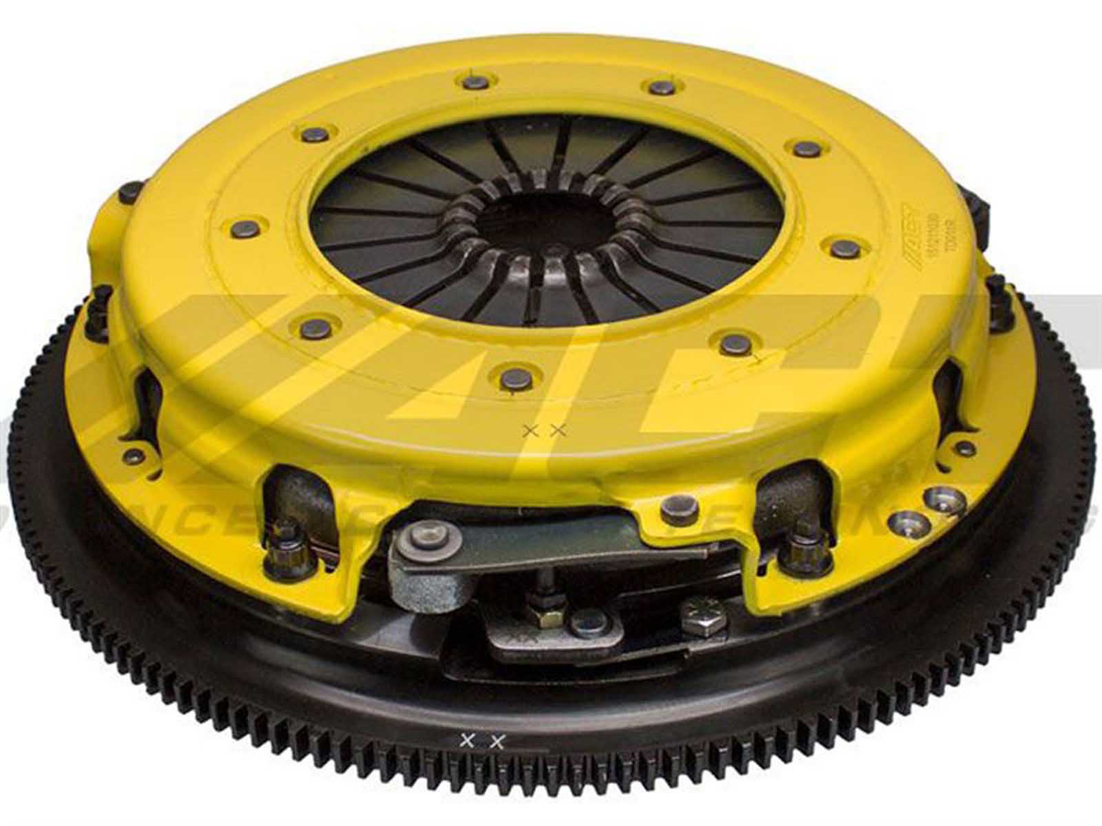 T1R-F01 twin disc kit offers twice the number of disc surfaces for better wear, heat capacity and long life compared to single disc kits. These kits use a proprietary Positive Lift Floater System design, which results in quiet operation with no floater rattle and no posts to wear. ACT twin disc kits endure an exclusive four-stage, heat treating process performed on all diaphragms. The ACT twin disc features the ability to adjust for disc wear and provides equal disengagement for discs. ACT’s 6-pad rigid race discs are made with high quality, ceramic friction materials. The chrome-moly hub is heat-treated for strength and durability. The lightweight, rigid design allows for quicker shifts and trouble-free service. All ACT twin disc kits include a CNC-machined and dynamically balanced flywheel to ensure trouble-free installation and operation. ACT twin disc kits include a pressure plate, two discs, a floater, flywheel and alignment tool. Some kits may include a pilot bearing and release bearing.