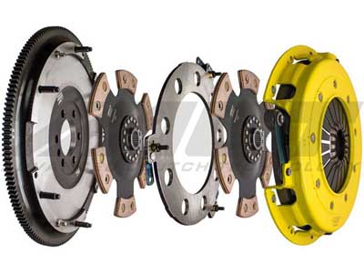 T1R-F08 twin disc kit offers twice the number of disc surfaces for better wear, heat capacity and long life compared to single disc kits. These kits use a proprietary Positive Lift Floater System design, which results in quiet operation with no floater rattle and no posts to wear. ACT twin disc kits endure an exclusive four-stage, heat treating process performed on all diaphragms. The ACT twin disc features the ability to adjust for disc wear and provides equal disengagement for discs. ACT’s 6-pad rigid race discs are made with high quality, ceramic friction materials. The chrome-moly hub is heat-treated for strength and durability. The lightweight, rigid design allows for quicker shifts and trouble-free service. All ACT twin disc kits include a CNC-machined and dynamically balanced flywheel to ensure trouble-free installation and operation. ACT twin disc kits include a pressure plate, two discs, a floater, flywheel and alignment tool. Some kits may include a pilot bearing and release bearing.