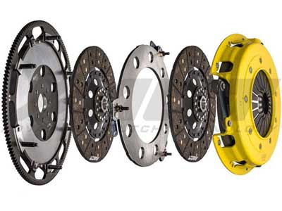 T2S-G05 street twin disc kit offers twice the number of disc surfaces for better wear, heat capacity and long life compared to single disc kits. These kits use a proprietary Positive Lift Floater System design, which results in quiet operation with no floater rattle and no posts to wear. ACT twin disc kits undergo an exclusive four-stage, heat treating process on all diaphragms. The ACT twin disc features the ability to adjust for disc wear and provides equal disengagement for discs. The ACT Performance street rigid-hub discs feature premium organic materials with high copper content for better heat transfer and steel-backed lining for greater burst strength and durability. The chrome-moly hub is heat-treated for strength and durability. Rivet design and materials are carefully selected for maximum strength. All ACT twin disc kits include a CNC-machined and dynamically balanced flywheel to ensure trouble-free installation and operation. ACT twin disc kits include a pressure plate, two discs, a floater, flywheel and alignment tool. Some kits may include a pilot bearing and release bearing.