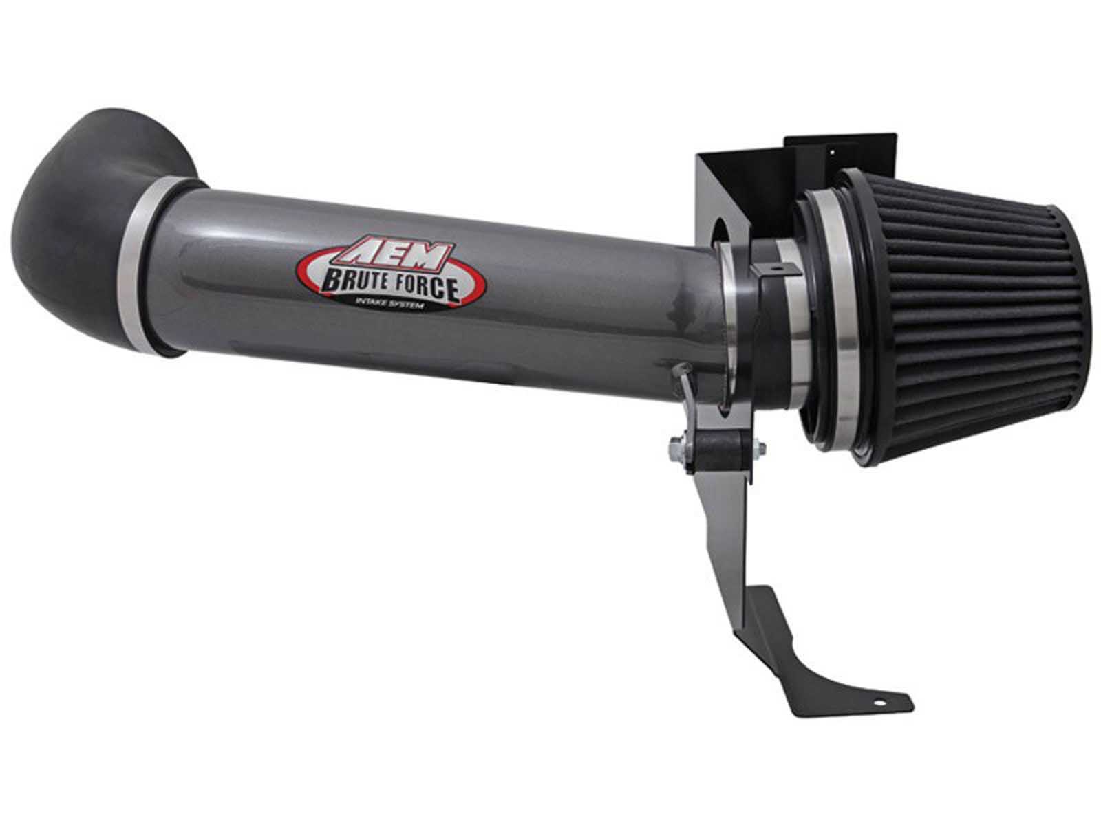 The AEM Brute Force Air Intake System produces horsepower and torque gains by replacing the vehicle's restrictive factory air filter and air intake housing. This air intake system was designed, tuned and dyno-tested to fit your specific model. Air enters the system through an extra-large AEM Dryflow synthetic washable air filter for outstanding air flow, filtration and performance. The air filter is located in the original air box space and is protected by a heat shield which is designed to reduce intake air temperature and increase horsepower. The intake tubing is constructed from mandrel-bent aluminum featuring a durable gunmetal gray powder coated finish. This air intake system was developed to accommodate the engine's factory emissions control devices including the MAF and crankcase vent line. The tapered cylinder shaped AEM Dryflow air filter is made from an oil-free, synthetic filter media that can be used for up to 100,000 miles before cleaning is needed (depending on driving conditions). The air intake system is backed by AEM's Lifetime Limited Warranty. Some AEM air intakes are not legal for sale or use in California and other states adopting California emission standards, while others are 50 state legal.