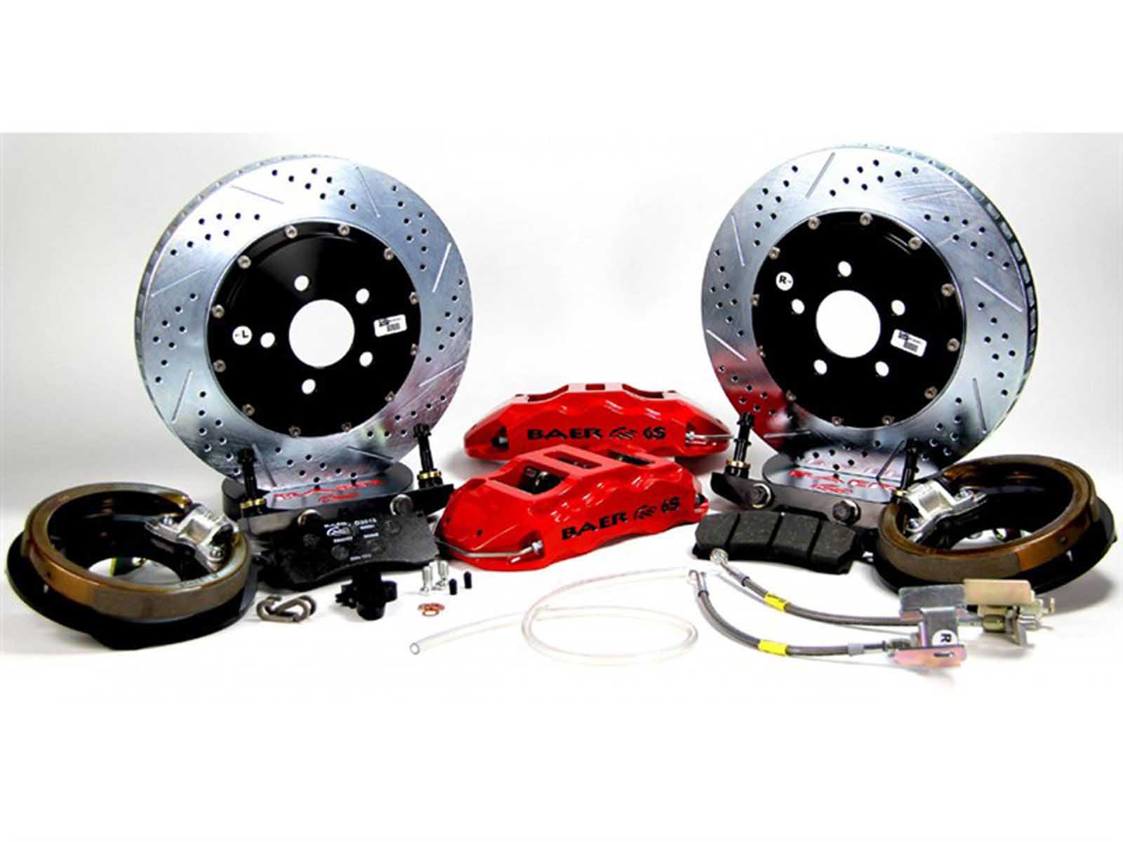 - Rear systems for c-clip style axles include Baer’s Verislide self-centering brackets.