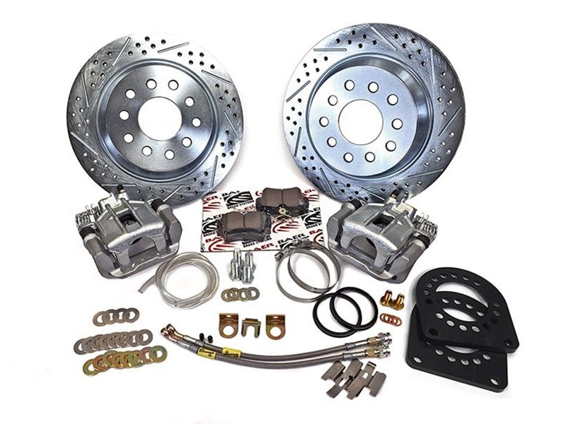 System Includes: Calipers, Rotors, Brackets, stainless braided brake hoses & system hardware. Does not include park brake cables, these can be purchased from either Lokar or Control Cables.