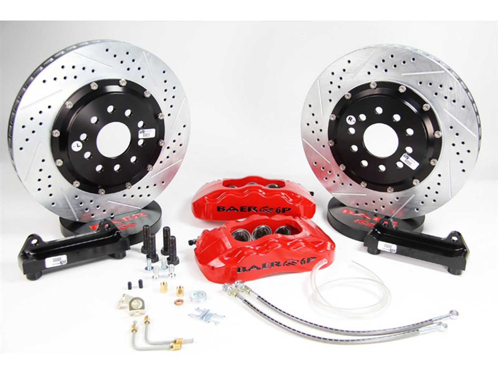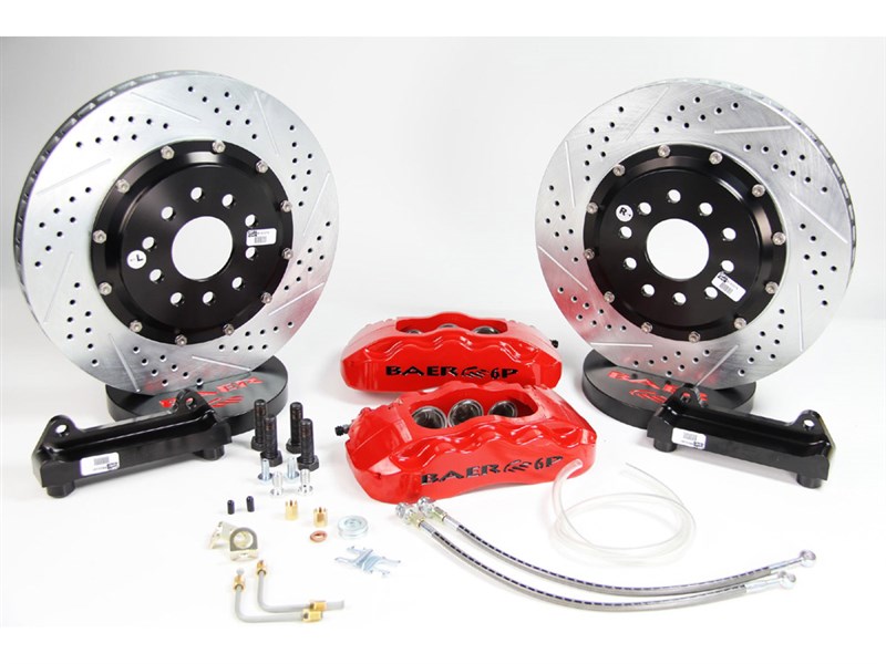 - Rear systems for c-clip style axles include Baer’s Verislide self-centering brackets.