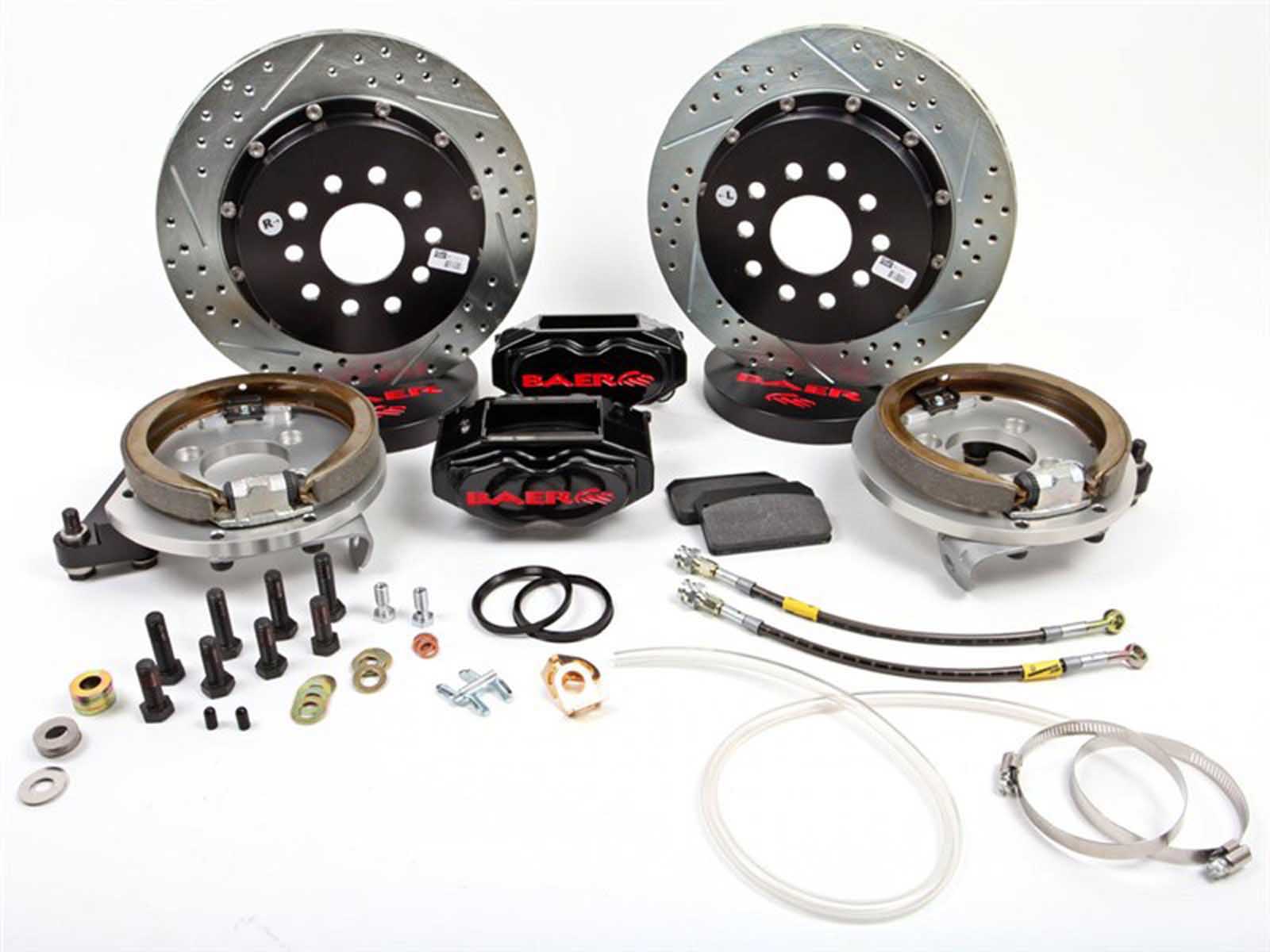 These Baer Rear Big Brake Kits from Accesspeed can be used alone or matched with one of Baer’s front brake system offerings. If a parking brake is not a concern, a number of the fixed bearing rear ends (NON c-clip), Ford 9”, 10/12 bolt with a 3.150 bearing, the SS4+ 11” rear is an option that will cosmetically match the front. If you are looking for a parking brake, check out the SS4 rear, this features a 12” 1-piece rotor (larger and 1-piece due to a drum in hat park brake). The SS4+ 13” rear is a great option for a customer looking at the Pro+ or Extreme+ front that doesn’t need or want that big of a brake on the rear.