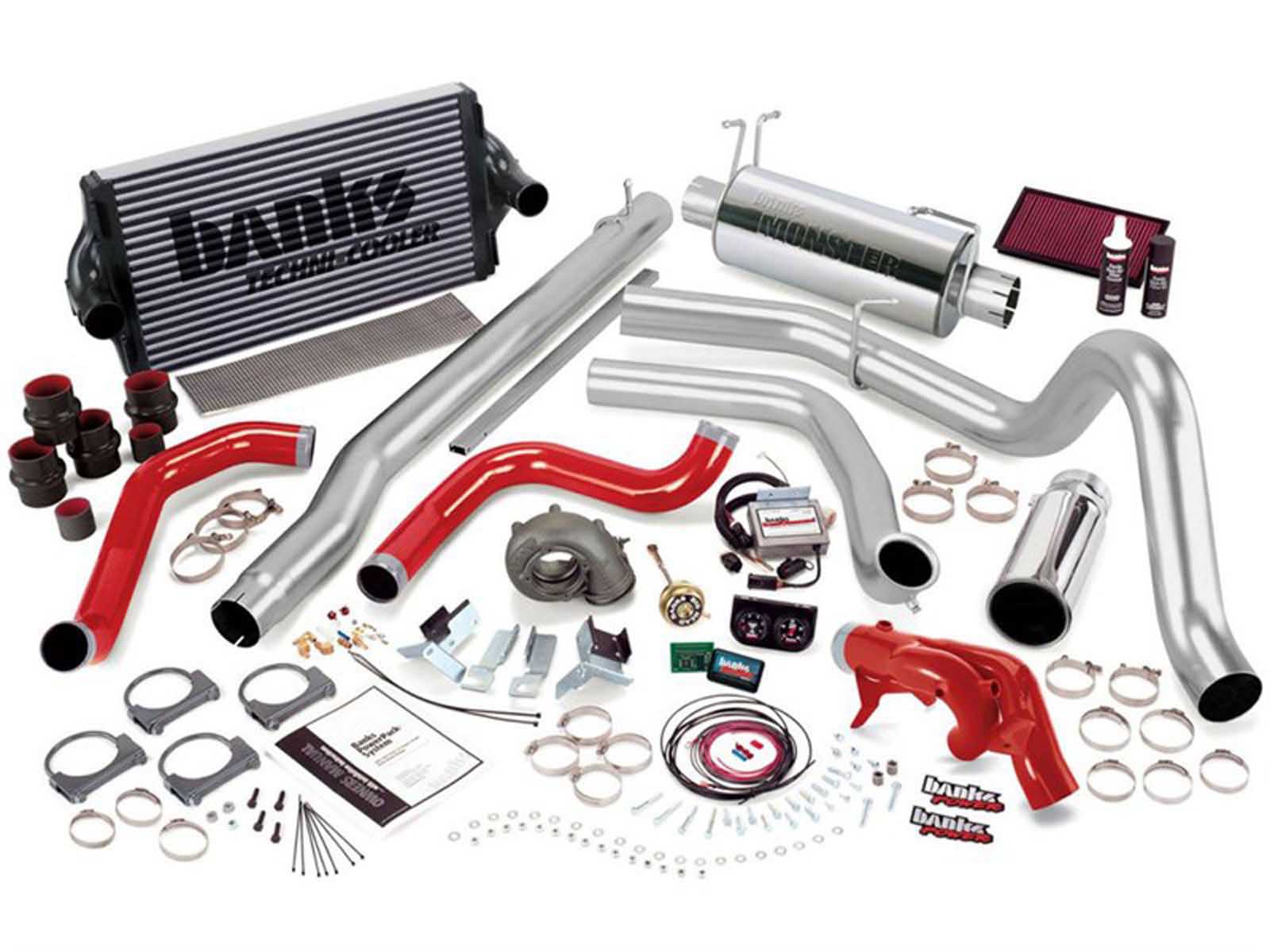 Includes: Ram-Air Oiled Filter, Air Filter Service Kit, Techni-Cooler Intercooler System, Turbine Housing, BigHead Wastegate Actuator, Monster Turbine Outlet Pipe, Monster Exhaust System, Black Tailpipe, Heatshield, Banks Power Urocal, CARB Decal, Includes all necessary hardware.