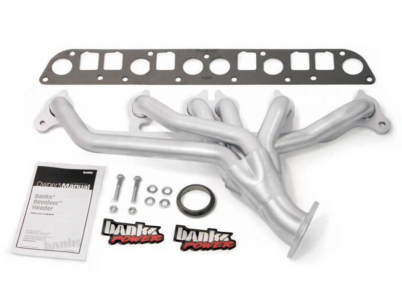 With more power, quicker acceleration, and tougher construction than ever, the new Banks Revolver® out muscles any competitive exhaust manifold: period! You'd think that being made from super-durable, mandrel-bent 409 stainless steel tubing and sporting a 1/2 inch thick precision ported and machined flange was enough... but there's more. The header is fortified with a "Revolver" collector which features Banks' patented "Power Pickle" exhaust collector technology. The Revolver manifold features a longer center tube in the 6-cylinder exhaust collector which captures exhaust pulse action and turns it into massive torque throughout the operating range. Powering through the roughest terrain is no longer a question.