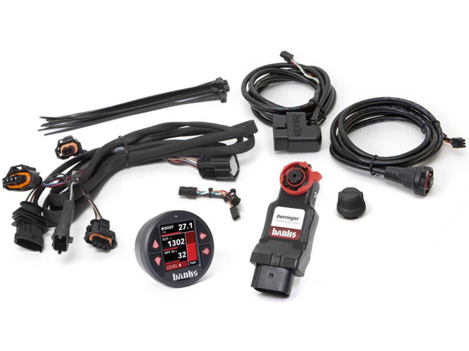 Results in torque and power gains across the full operating rpm range, starting right off idle and marching to the shift point in each gear. Derringer is dyno calibrated to use multiple data inputs such as throttle position, rpm, vehicle speed, AFR, knock, coolant temperature, and EGT, just like your engine's ECM. It actively and safely optimizes calibrations in real-time thanks to its OBD-II connectivity. No competitive tuner does that. Derringer has 6 levels, adjustable on-the-fly using the iDash. Level 6 produces best-in-class performance. Level 3 is designed for work use and has a great mid-range feel. When running Level 3 with a loaded truck and/or pulling a trailer, your on-ramp merging speeds and passing times are greatly improved. The electronics are enclosed in a compact housing which is easily concealed and communicates with other Banks devices such as our iDash DataMonster, iDash SuperGauge, and PedalMonster throttle booster. The Derringer connects in line with your truck's engine sensors. But unlike other tuners, it also connects to the vehicle's OBD-II diagnostic bus. ActiveSafety health monitoring circuitry keeps an eye on the vehicle and the module itself. It checks its health 100 times a second. If it detects an issue, the Derringer instantly bypasses itself, sets a device diagnostic code, and seamlessly returns the truck to stock power. Plus, Derringer's special coolant temp monitoring prevents power addition when the engine is too cold or overheated. The Derringer also auto-adjusts power if knock occurs due to bad fuel. Maximum safe power is all automatic with a Derringer — you just choose your preferred power level and enjoy the ride.