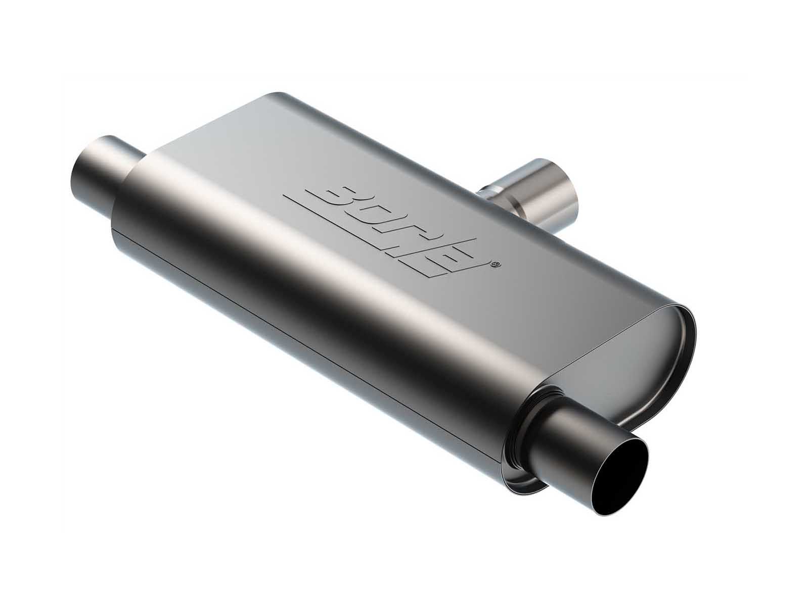 The Borla Transverse 'T' Flow design Muffler from Accesspeed incorporates a single 2.5" inlet on side of muffler body with dual 2.5" offset outlets, one on each end of the muffler body. The internal flow of this muffler is a 'T' pattern. Reversible design for installation flexibility. High-quality T-304 austenitic stainless steel will never rust. 100% welded construction for strength. Free Flow design for improved performance. High-temperature continuous filament fiber (CFF) acoustic material for sound control. Natural mill finish can be brushed or polished prior to installation. Best of all, Borla stands behind every polished tip assembly with a Million-Mile Warranty. Just what you would expect from the world‘s most experienced (and most winning) exhaust brand.