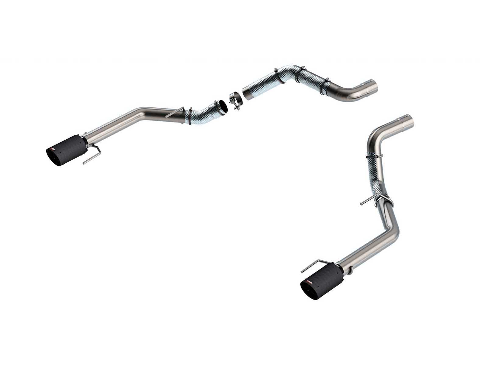 Borla 3" diameter Tail Pipes from Accesspeed feature single 4.5" round carbon fiber tips with black anodized centers on each tail pipe. They will fit with either Borla 60728, 60736, or 60737 mid-sections / muffler assemblies, or the Original Equipment (O.E.) mid-section / muffler assembly. Tail Pipes with black chrome on T-304 stainless steel tips, or Brawler style black coated T-304 stainless steel tips are also available. Includes heatshields on pipes.