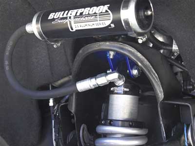 The Bulletproof Suspension Titan kit features a one-piece lift cage, fabricated spindle uprights with aircraft grade Chromoly Heim outer steering, heavy duty coil over spacers, Atlas Leaf Springs (no blocks or shackle extensions on our kit), complete instructions with photos and hardware kit labeled for each step of the installation. Two shocks are required for the rear and we offer Standard Shocks or the Bulletproof Suspension Remote Reservoir Shocks as options. Bulletproof Suspension also offers a Uni-Ball Upper Control arm as an upgrade. Whether it be off-road or on road you can count on, Bulletproof Suspension is getting you there above the rest.