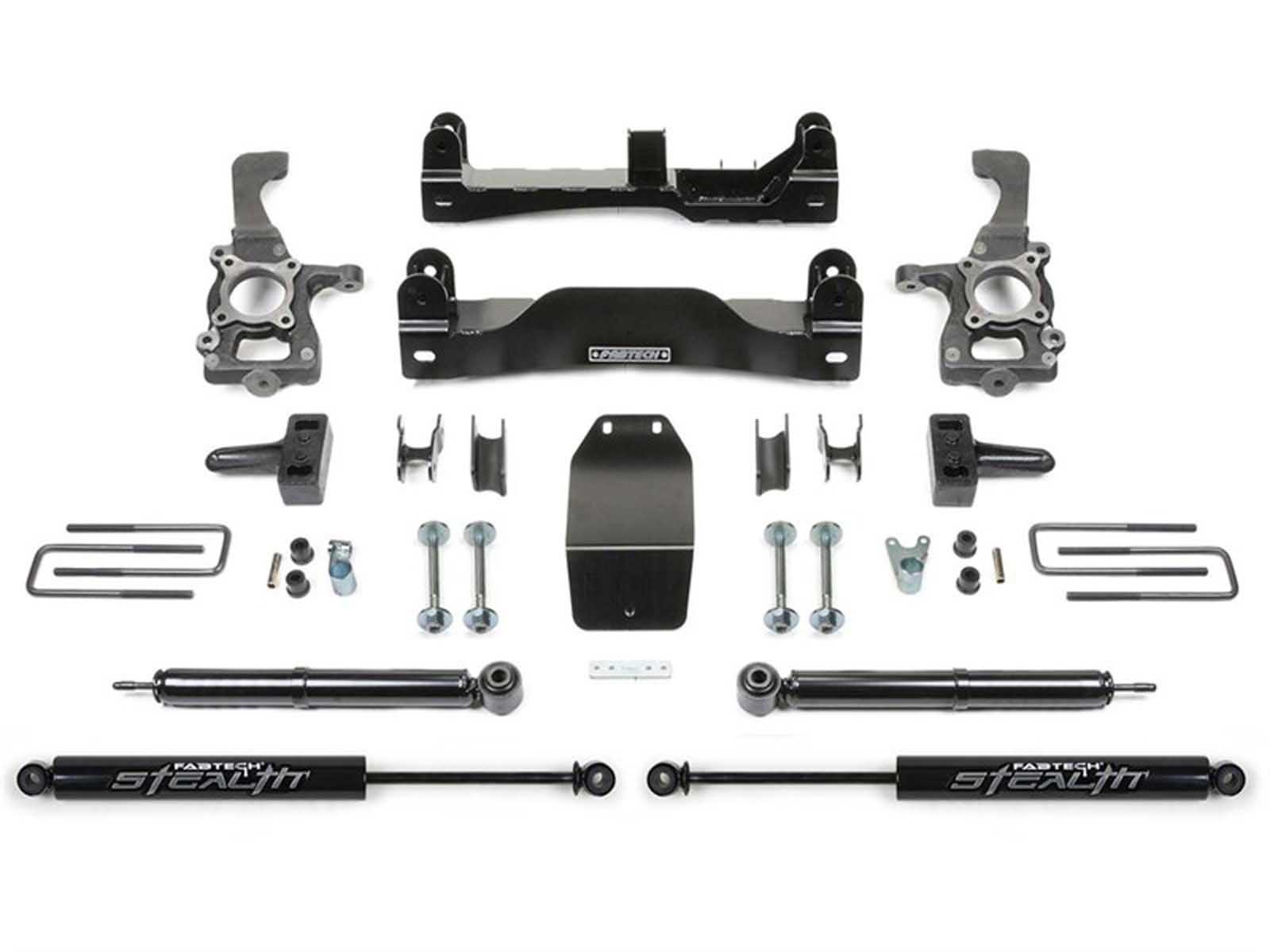 Fabtech’s new 4” F150 system utilizes their proven heavy duty construction and design features found in their 6” systems but with less lift and at a much lower price. This 4” System allows use of 35” tall tires and features high arched lower control arm crossmembers constructed of 1/4 “ thick steel for maximum strength. The Fabtech ductile iron steering knuckles retain the stock track width keeping tires under the fender for a clean appearance. Rear lift is accomplished with a block and u-bolt configuration.