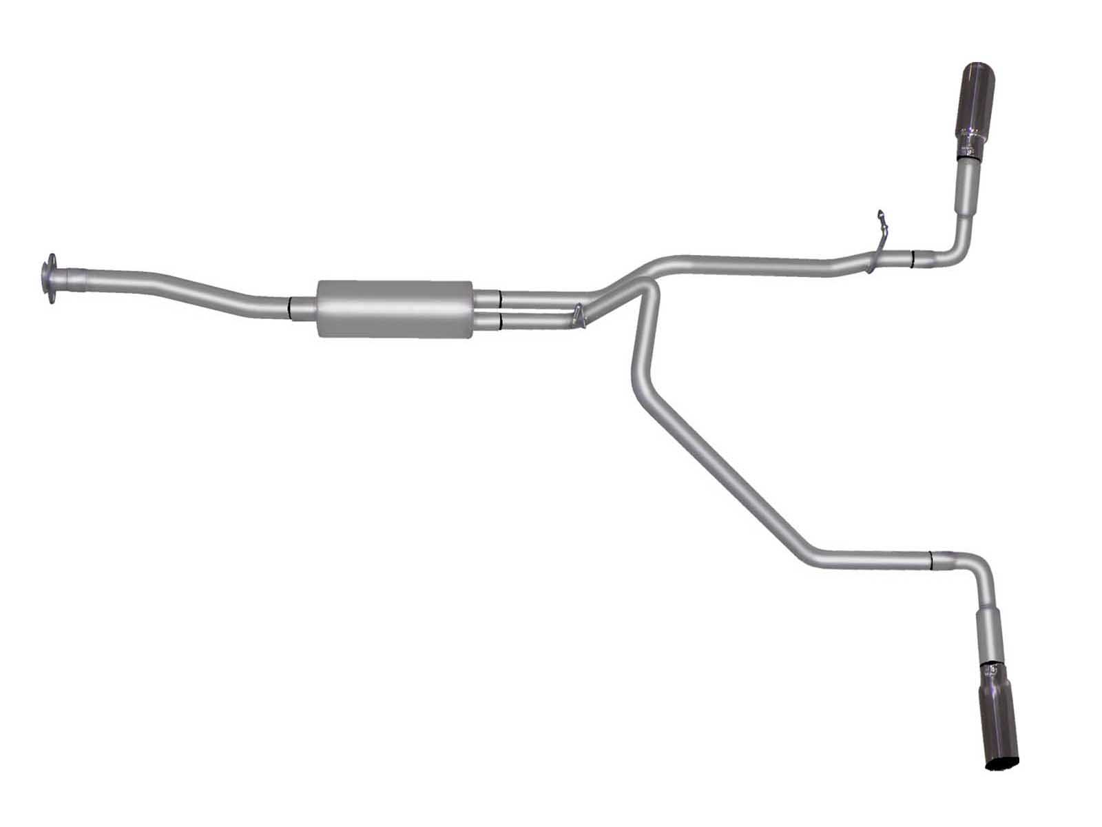 For the extremist who wants to take their truck to the next level, this dual bolt-on Cat back system is for you. This system exists behind the rear tires at an aggressive angle with a powerful exhaust tone. You will gain bold street looks with powerful dyno tuned and tested street performance gains. You can expect to experience gains on average of 15-20 horsepower. Gibson muffler provides a mean performance sound and complemented with polished Stainless Tip. Easy bolt-on installation. No welding required. Backed by a Lifetime Limited Warranty. If you want Extreme, this system is it.