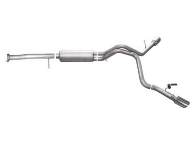 For the extremist who wants to take their truck to the next level, this dual bolt-on Cat back system is for you. This system exists behind the rear tires at an aggressive angle with a powerful exhaust tone. You will gain bold street looks with powerful dyno tuned and tested street performance gains. You can expect to experience gains on average of 15-20 horsepower. Gibson muffler provides a mean performance sound and complemented with polished Stainless Tip. Easy bolt-on installation. No welding required. Backed by a Lifetime Limited Warranty. If you want Extreme, this system is it.
