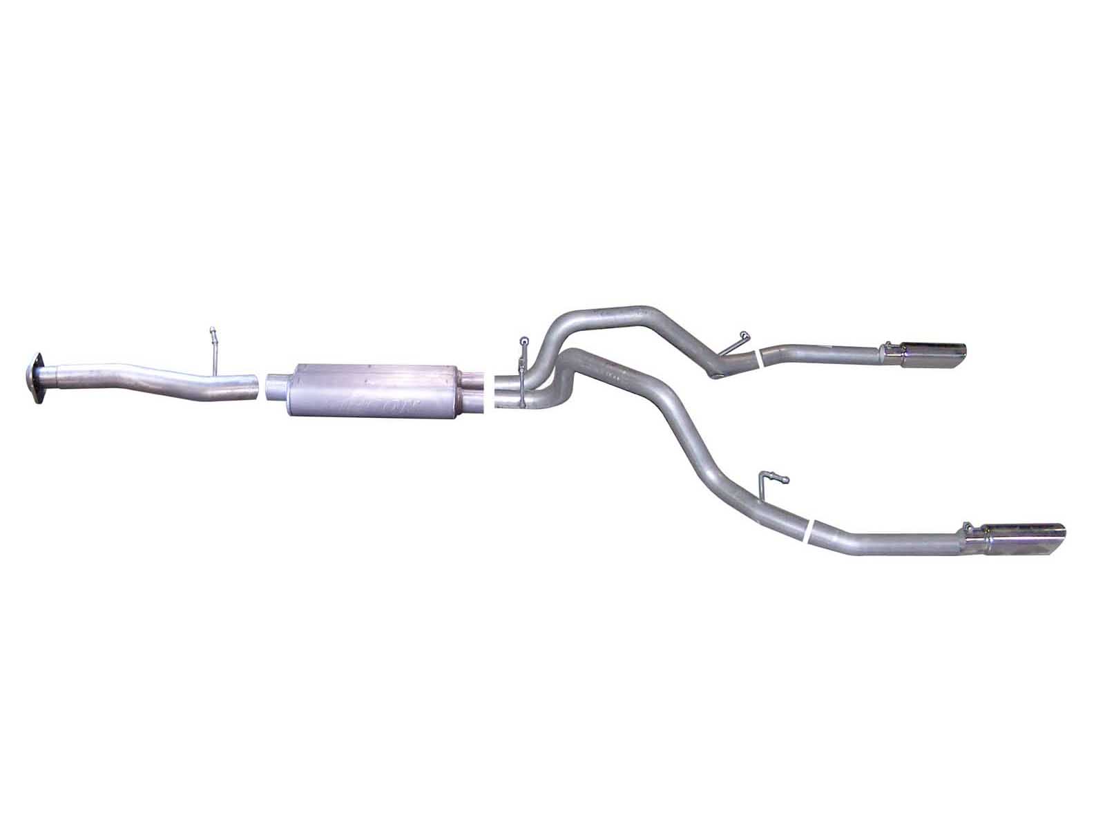 For the enthusiast who wants an awesome look and aggressive throaty sound this Dual Split Cat back exhaust is for you. Gibson Exhaust Systems decrease backpressure and produce more torque and increased horsepower. Typical gains average of 15-20 horsepower. Stainless dual Tip exit straight out the back. Works with most bumpers, roll pans and trailer hitches. Exhaust sound is louder under towing conditions. Hassle Free bolt- on installation. No welding required. Backed by a Lifetime Limited Warranty.
