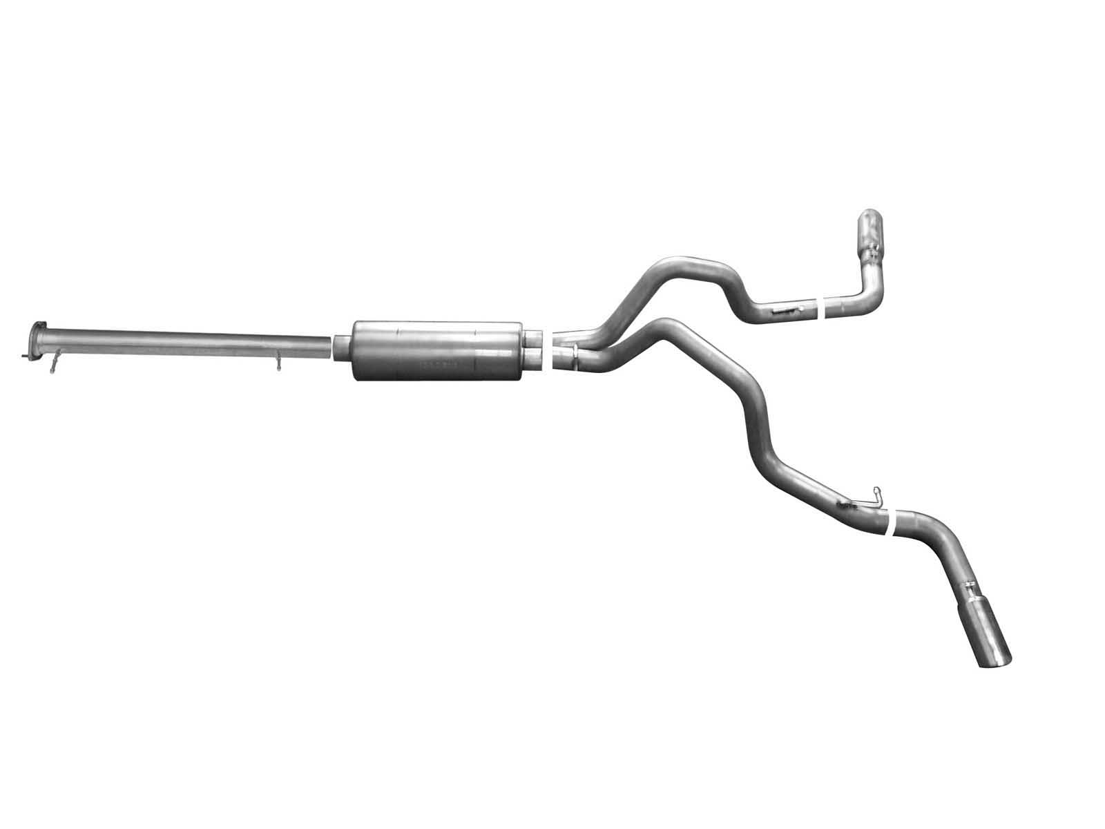 For the extremist who wants to take their truck to the next level, this dual bolt-on Cat back system is for you. This system exists behind the rear tires at an aggressive angle with a powerful exhaust tone. You will gain bold street looks with powerful dyno tuned and tested street performance gains. You can expect to experience gains on average of 15-20 horsepower. Gibson muffler provides a mean performance sound and complemented with polished Stainless Tip. Easy bolt-on installation. No welding required. Backed by a Lifetime Limited Warranty. If you want Extreme, this system is it.