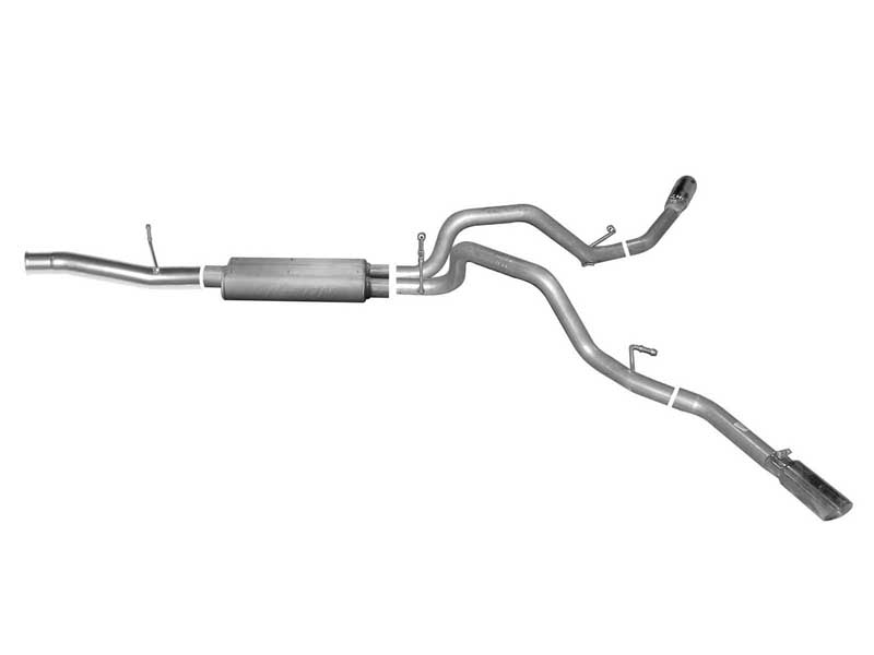 For the extremist who wants to take their truck to the next level, this dual bolt-on Cat back system is for you. This system exists behind the rear tires at an aggressive angle with a powerful exhaust tone. You will gain bold street looks with powerful dyno tuned and tested street performance gains. You can expect to experience gains on average of 15-20 horsepower. Gibson muffler provides a mean performance sound and complemented with polished Stainless Tips. Easy bolt-on installation. No welding required. Backed by a Lifetime Limited Warranty. If you want Extreme, this system is it.