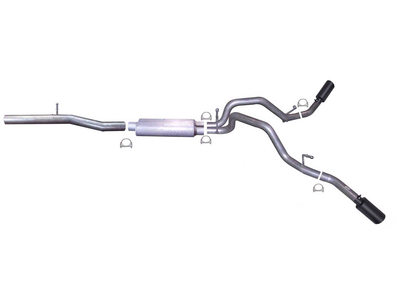 For the extremist who wants to take their truck to the next level, this Black Elite dual bolt-on Cat back system is for you. This system exists behind the rear tires at an aggressive angle with a powerful exhaust tone. Each T-304 stainless tip is offered with a premium black finish applied with Gibson's formulated process exclusive only to the Black Elite You will gain bold street looks with dyno tuned and tested street performance gains. For increased Performance, this exhaust system pushes the sound through our proven stainless steel Superflow Muffler giving you a vigorous deep tone. It's manufactured with high quality stainless steel tubing and backed by a limited lifetime warranty. With this perfect combination, Gibson Performance exceeds expectations with the ability to offer quality and style beating their competitors while being Made in the USA.