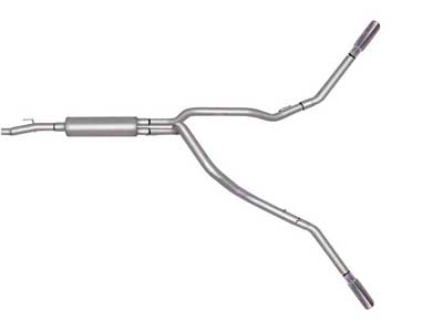 For the extremist who wants to take their truck to the next level, this dual bolt-on Cat back system is for you. This system exists behind the rear tires at an aggressive angle with a powerful exhaust tone. You will gain bold street looks with powerful dyno tuned and tested street performance gains. You can expect to experience gains on average of 15-20 horsepower. Gibson muffler provides a mean performance sound and complemented with polished Stainless Tip. Easy bolt-on installation. No welding required. Backed by a Lifetime Limited Warranty. If you want Extreme, this system is it.
