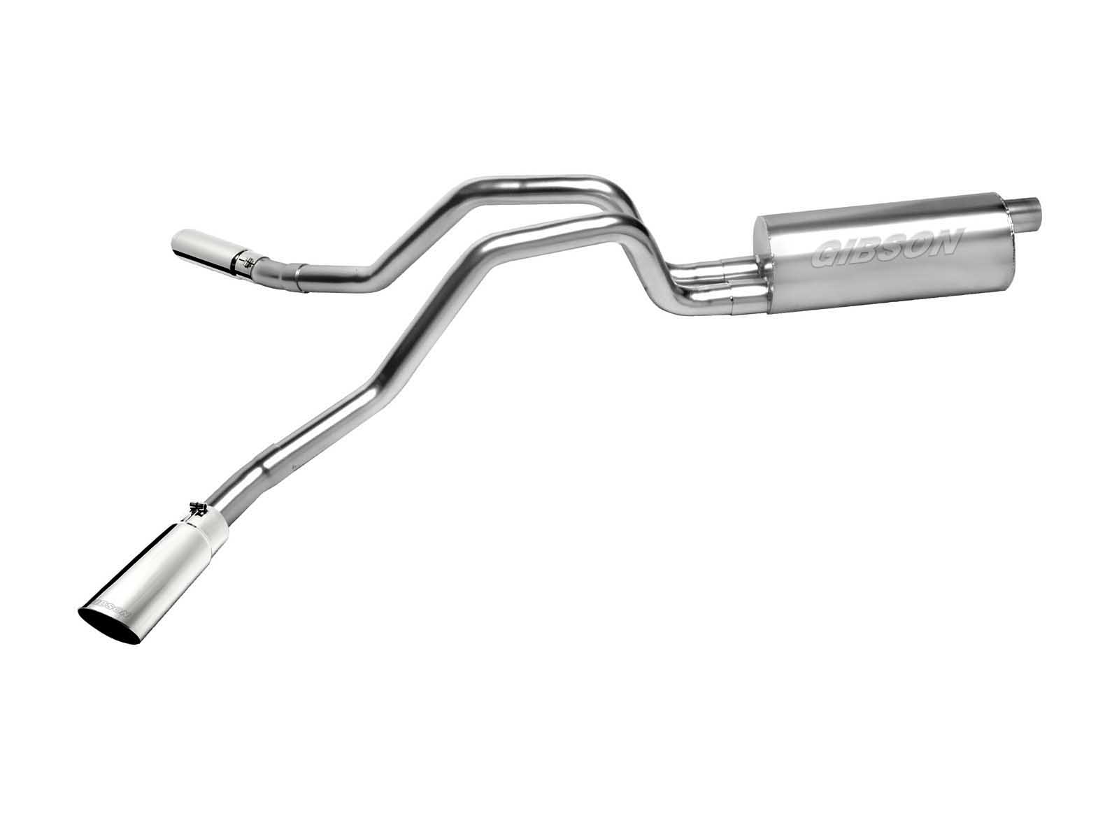 For the extremist who wants to take their truck to the next level, this dual bolt-on Cat back system is for you. This system exists behind the rear tires at an aggressive angle with a powerful exhaust tone. You will gain bold street looks with powerful dyno tuned and tested street performance gains. You can expect to experience gains on average of 15-20 horsepower. Gibson muffler provides a mean performance sound and complemented with polished Stainless Tip. Easy bolt-on installation. No welding required. Backed by a Lifetime Limited Warranty. If you want Extreme, this system is it.