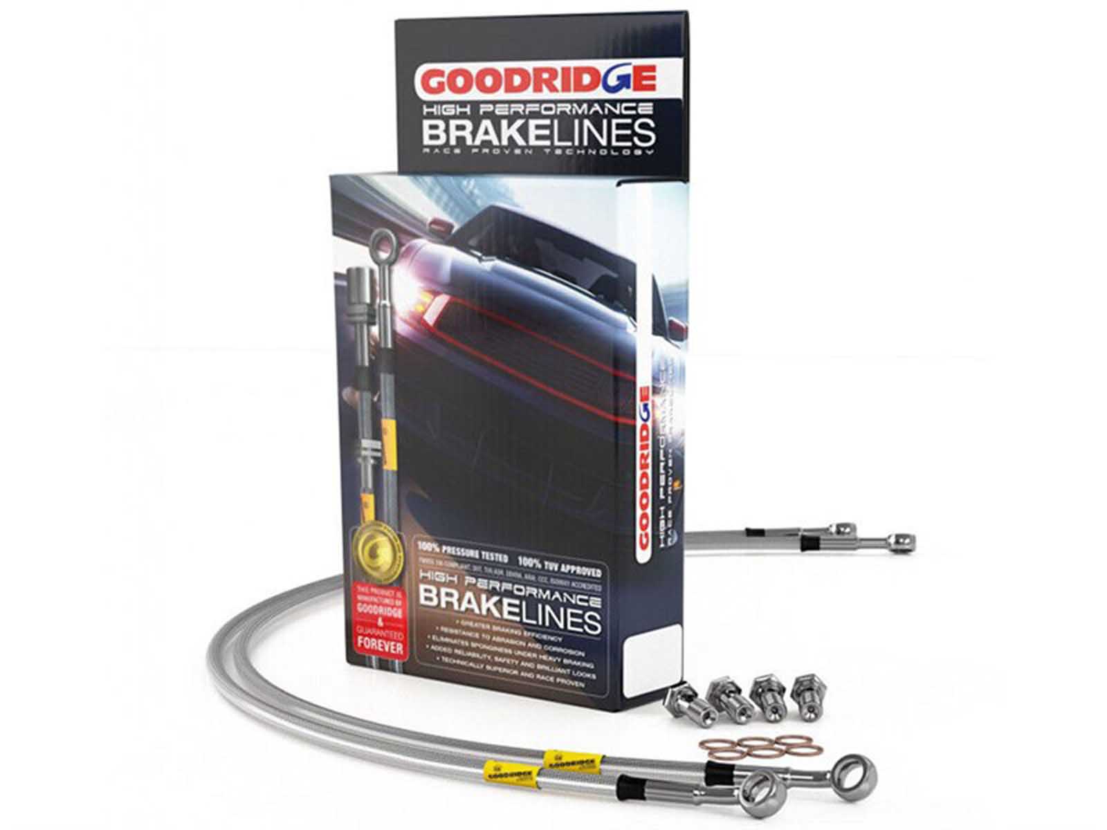Goodridge G-Stop Brake Line Kits are constructed from the finest quality hose, consisting of a PTFE inner and stainless steel overbraid. Replacing OE brake lines with -03 PTFE hose improves brake feel over factory lines, eliminates sponginess, and provides shorter stopping distances and consistent braking in performance applications. The shorter stopping distances and improved pedal response provide safety features as well as performance advantages. All G-Stop lines go through a nine-point quality assurance testing including the materials tensile strength and 3000 psi pressure ratings. When used with an ABS braking system they virtually eliminate brake pedal “chatter”. All G-Stops conform to FMVSS106-Federal Motor Vehicle Safety Standard- making them DOT compliant and are TUV approved-the German standard that most international regulations follow. This kit includes two front lines and one rear center line.