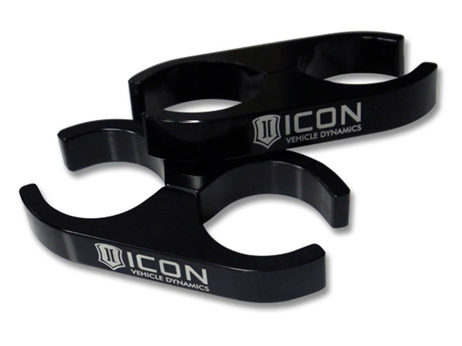 ICON Vehicle Dynamics 2.0 Aluminum Shock Reservoir Clamp Kit - 2.0 to 2.0. These precision CNC machined 6061 billet aluminum shock clamps come standard with a polished then anodized finish to give them a nice gloss black finish. This is a great upgrade for your ICON V.S. 2.0 Aluminum Series Reservior shocks over the standard hose clamp.