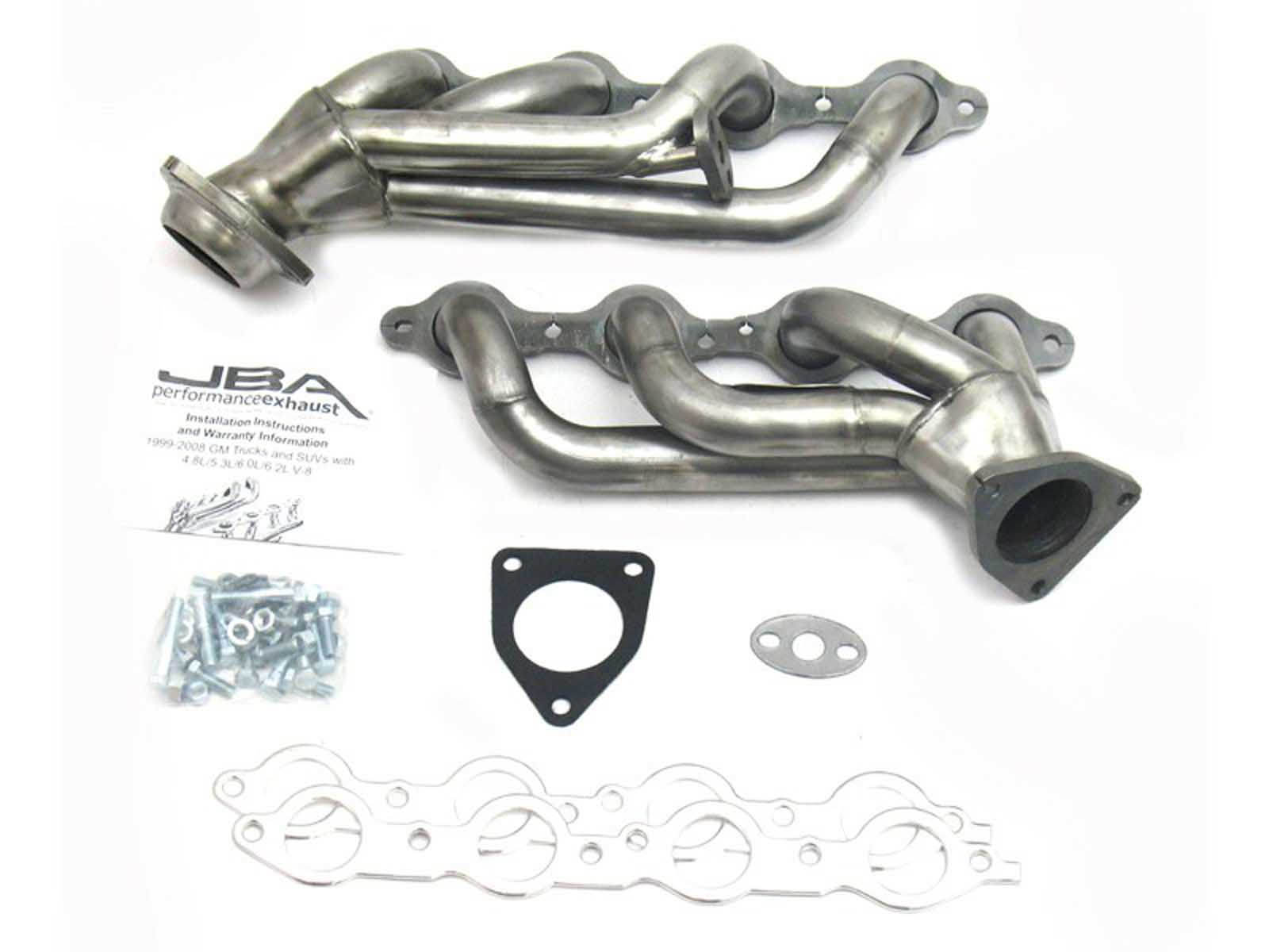 JBA shorty headers are one of the best performance upgrades available for any application. Hot Rod magazine rated headers as one of the top 10 power parts installed on a vehicle. JBA shorty headers are significantly less restrictive than the stock manifolds on a vehicle and dramatically increase the power and efficiency of an engine. JBA's original shorty design is an innovation of the previous long tube header. The new shorty designs yield high performance gains that hot-rodders and enthusiasts look for. With durable stainless-steel construction that can survive the abuse of racing, towing, and daily driving, these headers can take a beating. With heavy duty features and proprietary technology, like the JBA Firecone collector JBA shorty headers have the capacity to produce more power than any other shorty headers on the market. Each system includes high quality hardware and thorough instructions for a professional no-leak installation. 1. Mandrel-bent stainless steel primary tubes- Best flow, durability, improved throttle response 2. Proprietary JBA Firecone collector- Race proven technology for maximum hp/tq gains 3. Factory style emission connections- Easier installation 4. Extra thick collector domes- Will not distort like lesser quality headers, no leaks 5. JBA Badge-Authentic JBA Quality 6. 3/8" thick machined flanges- Resists warping, prevents leaks, & easier install 7. Oversized exhaust ports- Increased flow, accommodates cylinder head porting 8. Available with two optional coatings polished metallic ceramic, titanium ceramic-increased corrosion protection, thermal barrier for lower under-hood temperatures.
