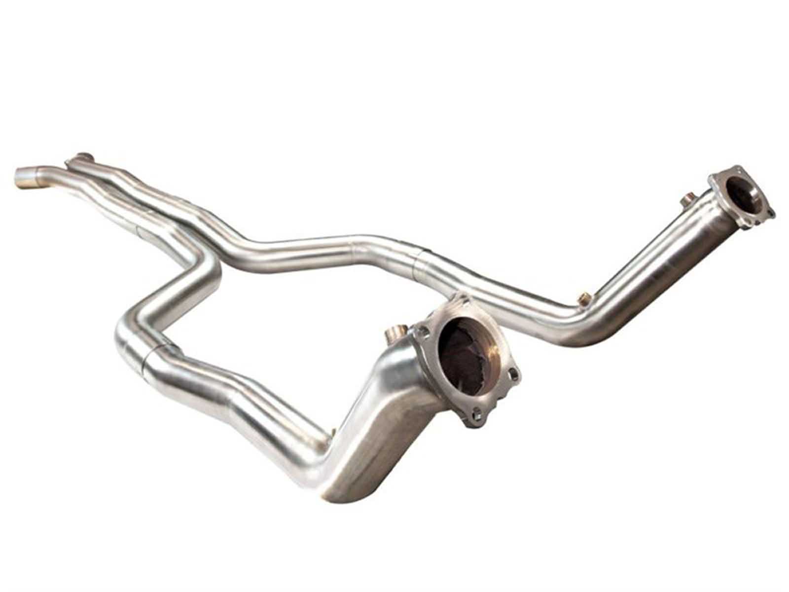 The 2016-2018 Cadillac ATS-V Complete Stainless Steel 3" Competition Only Performance Exhaust Kit Includes Kooks 3" Competition Only Turbo Downpipes, Kooks 3" Connection and Mid Pipes Connects to OEM Exhaust and Mufflers.
