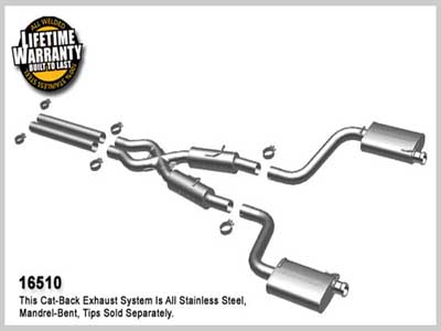 Unleash the power of your SRT8 with the best looking, smoothest sounding exhaust system available - The 2008,2009,2010,2011,2012, 2013 Dodge Challenger SRT8 6.1L, 6.4L V8 Hemi Exhaust System from MagnaFlow! Dual Cat Back Exhaust System All Stainless Steel, Mandrel-Bent , ( Re-use Original Challenger Stainless Steel Tips), TruX Pipe Built Into resonator.