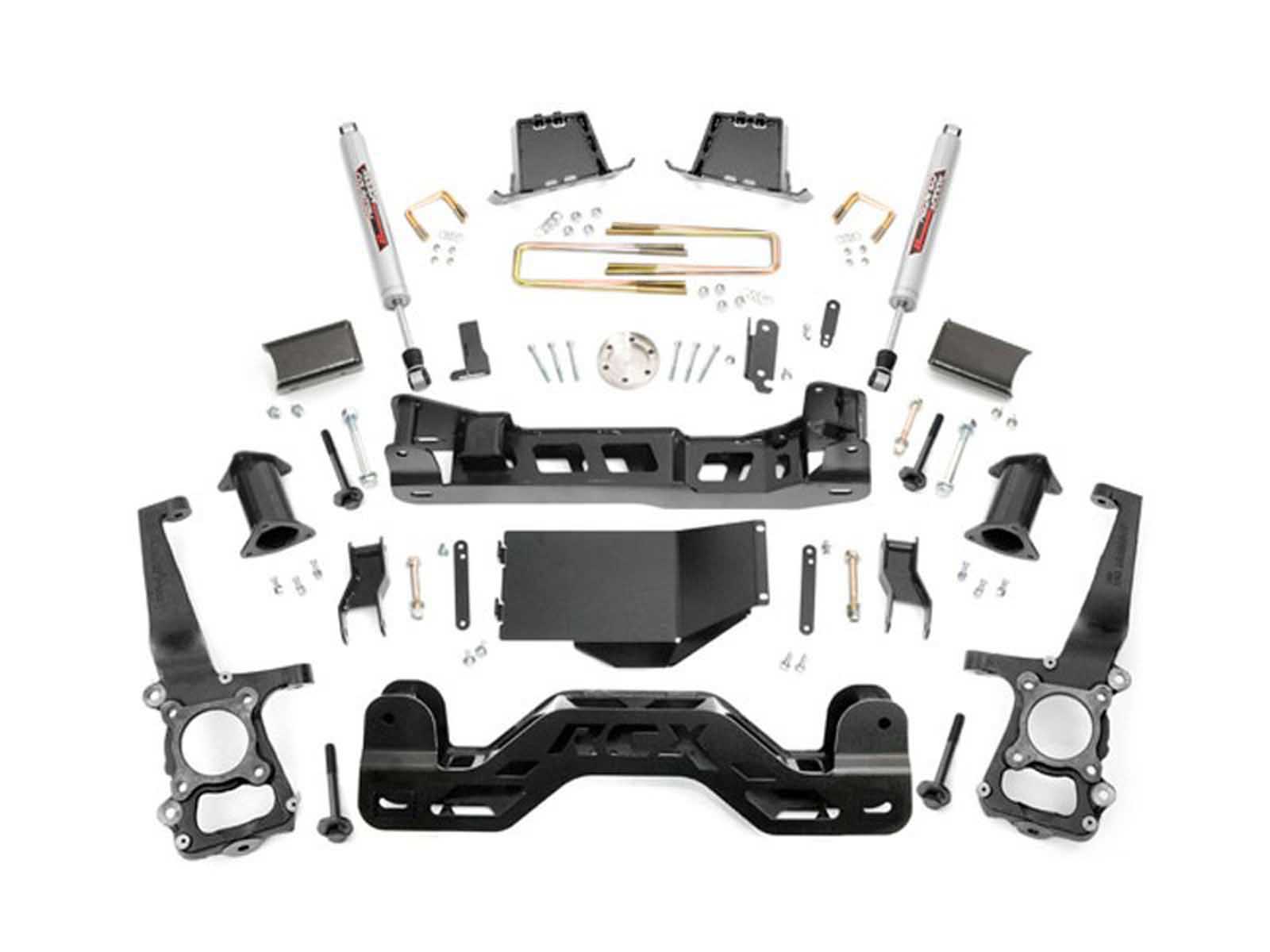 Give your '09 - '13 Ford F-150 an aggressive new look and unparalleled off-road performance with Rough Country's 6" Suspension Lift. This all-inclusive kit features everything needed to take your Ford off the freeway and into the fields. Featuring a set of durable lifted knuckles and strut spacers, you'll gain enough ride height to run up to 35" tires! A set of differential drop brackets, sway-bar drop brackets, brake line brackets, and a drive shaft spacer help keep everything at an optimum angle for a factory-like ride, even after lifting. A 1/4" thick plate steel front and rear cross member bring uncompromised strength and good looks to your truck, featuring a laser-cut "RCX" logo and an easy-to-install design. Our 4" Fabricated Rear Blocks offer considerably more strength than their cast iron counterparts, and were specifically engineered by Rough Country to prevent against axle-wrap. A set of Rough Country's premiere off-road shock absorbers - Performance 2.2's - are also included in this kit, featuring a large 2.2" diameter body with a chrome-hardened piston rod and long-lasting polyurethane bushings.