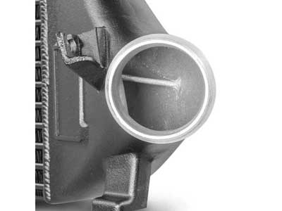 Optimal airflow & minimal back pressure: At the heart of the system is our high-quality competition intercooler core (tube fin), which ensures outstanding cooling performance with minimal back pressure. The cast aluminum end boxes, optimized in the CAD system using CFD simulations, maximize internal airflow. An integrated air guide in the inlet ensures even filling of the core.