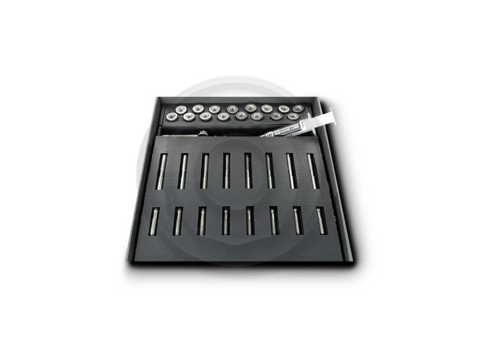 This set replaces the original cylinder head bolts with high-strength Pro-Series 18.8 stud bolts. This is necessary in the case of significant performance increases, as the original cylinder head bolts elongate during operation and the cylinder head can lift off. The Pro-Series 18.8 stud bolts with a tensile strength of 1850 N/mm² provide a remedy for this. In addition, these stud bolts do not need to be replaced after disassembly, but can be reused.