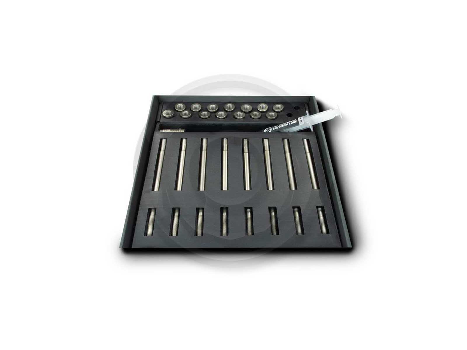 This set replaces the original cylinder head bolts with high-strength Pro-Series 18.8 stud bolts. This is necessary in the case of significant power increases, as the original cylinder head bolts can elongate during operation and the cylinder head can lift off. The Pro-Series 18.8 stud bolts with a tensile strength of 1850 N/mm² provide a remedy for this. In addition, these stud bolts do not have to be replaced after disassembly, but can be reused.