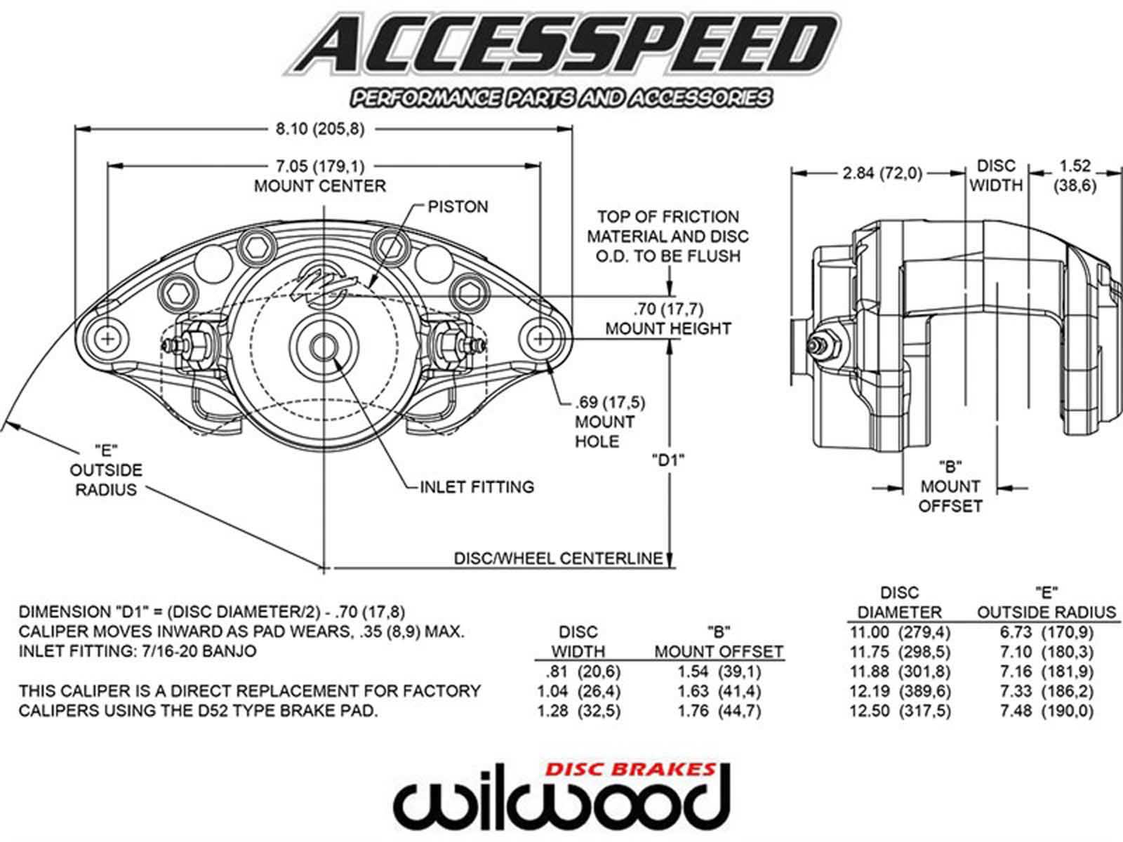 Wilwood's newest pure heavy-duty race caliper, the D52-R starts with a lightweight 4.3-pound forged aluminum Type III hard anodized body with a stainless-steel piston. Choose a width of 2.75" or 2.38" pistons, and rotor widths of 0.81", 1.04" and 1.28" thick in common 11.75", or 12.19", and up to 12.50" diameters. Caliper fluid inlet port centered directly behind the piston eliminates any interference with slide pins. Lower deflection rate and higher volumetric efficiency than all the competitions’ heavier cast models, D52-R calipers also use standard D52 pads available in a range of compounds for every application. Caliper mounting uses the original GM stock height and offset. D52-R Caliper, also known as D52R Caliper, is the pinnacle design for OEM replacement racing calipers.