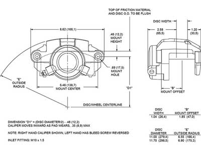 There are three piston configurations available for the D154: A large 2.50" single piston, and two two-piston models featuring 1.62/1.62" or 1.12/1.12" pistons. All three calipers utilize stainless steel pistons. Stainless pistons are used to resist corrosion and retard heat transfer from the pads into the caliper body. High temperature, square faced bore seals are used to provide controlled piston retraction and reliable performance from the wider sealing face. This combination of components is a proven performer with long service life and a history of reliable performance in any type of driving environment, including extreme sustained high temperature racing applications. The caliper slide pin holes are fitted with dampening rings to minimize noise from vibration. The caliper is also fitted with bleed screws on both ends to facilitate mounting in any left hand or right hand, front leading mount, or rear trailing mount locations.