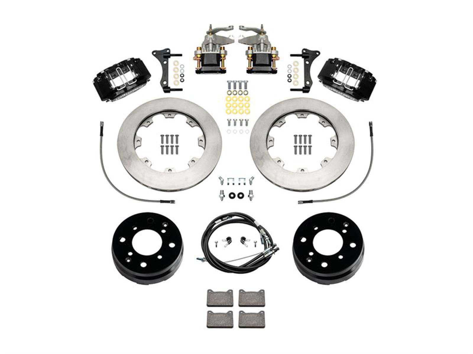The Wilwood Powerlite Rear MC4 Parking Brake Kit from Accesspeed provides an easy upgrade to 4-piston Powerlite calipers. This kit contains Powerlite main calipers, MC4 parking brake calipers, 2-piece rotor and hat assemblies and BP-10 performance pads. This kit uses the stock rear upright mounting. Kits come complete with hardware, parking brake cable and stainless steel Flexlines.