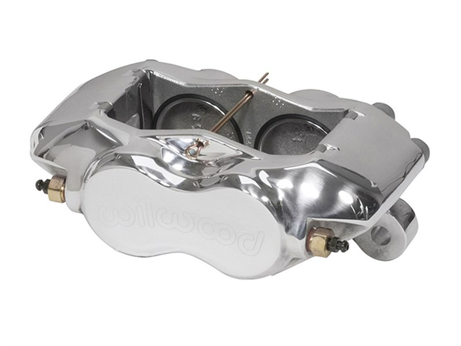 The superior strength of this innovative design is combined with proven performance features from Wilwood's earlier designs. Each caliper is equipped with Wilwood's SRS stainless steel bridge plates. The SRS plates eliminate the bridge wear caused by pad gouging and extend the service life of the caliper body. The spring-loading action of the SRS plates also eliminates pad rattle and dampens the vibration harmonics that contribute to squeal under braking. Other standard Wilwood features include high temperature seals and stainless-steel pistons to eliminate corrosion and retard heat transfer from the pads. Internal fluid passages eliminate the need for external tubes. Four corner bleed screws assure simple and effective air evacuation from the system and allow one caliper to be mounted in any front, rear, right or left position. Standard race calipers feature Wilwood's signature bright black anodized finish to resist corrosion and maintain their high-tech style. Polished calipers (shown at right) are also available for custom show car applications.