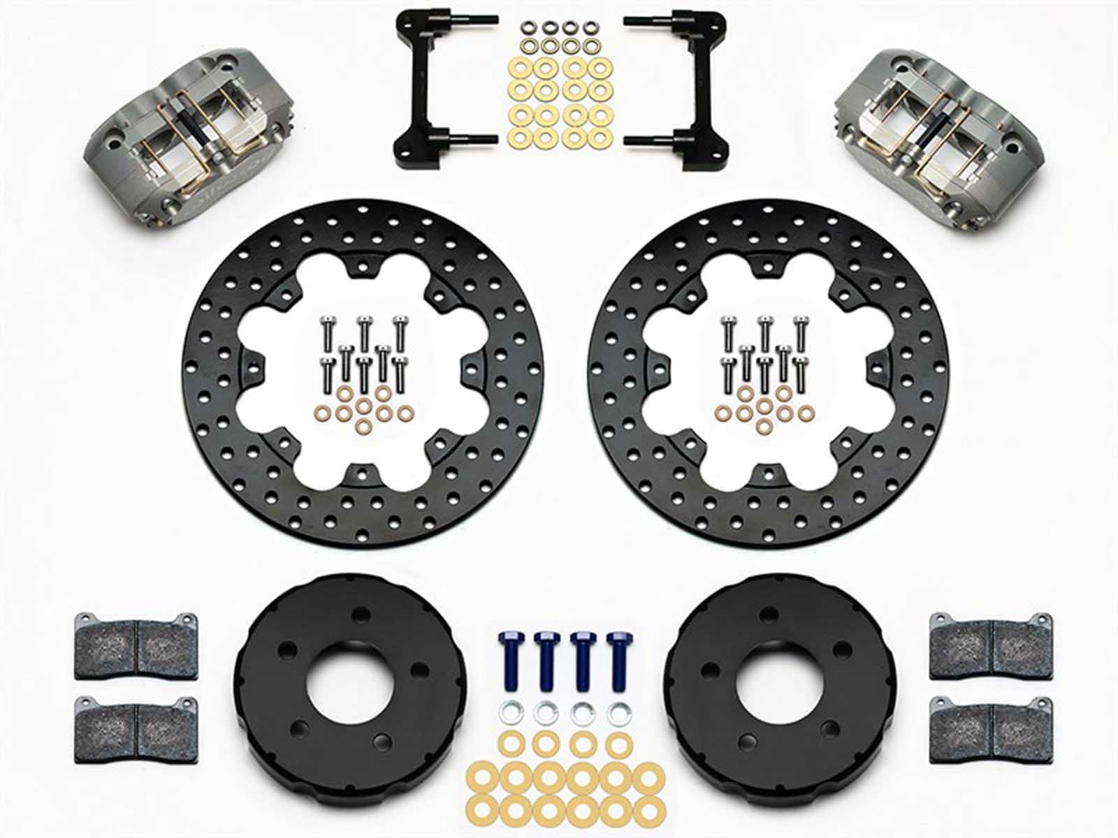 Wilwood Dynapro forged billet, radial mount four piston calipers are used in this select group of drag racing kits. The OE brakes on vehicles originally equipped with 16" or larger wheels generally do not fit inside the popular 15" drag wheels. Specially designed radial caliper mount brackets bolt directly to the OE caliper mount, and provide secure and accurate mounting for the NDPR caliper. Kits with 3/8" steel rotors are recommended for four-wheel disc brake cars up to 2,800 pounds. Kits with .81" rotors should be used on cars over 2,800 pound cars, or lighter cars running extreme speeds desiring increased rotor durability. Requires Wilwood Flexline Brake Lines, sold separately.