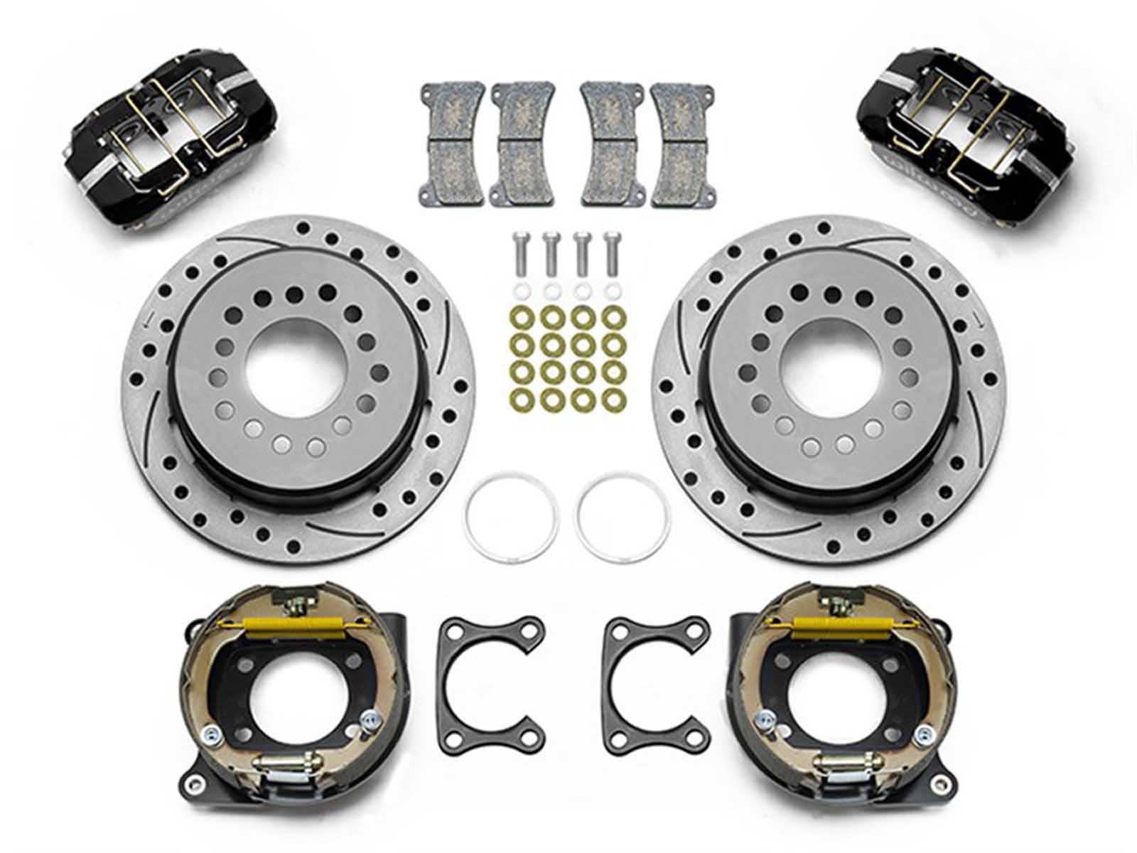 Wilwood Forged Dynapro Low-Profile Pro-Series rear disc brake kits provide a complete solution for popular muscle car rear axles on applications that require a parking brake assembly and extra clearance for 14-15" wheel size applications. Forged billet Dynapro Low-Profile four-piston calipers 11" one-piece hat and rotor assemblies, and high friction pads provide optimized and balanced braking for all types of custom performance street/strip and show machines. The neatly hidden internal shoe system provides a clean installation with superior static holding power for parking. Optional caliper finishes and rotor designs enable the builder to personalize the style and optimize brake performance for every individual application. Requires Wilwood Flexline Brake Lines, sold separately.