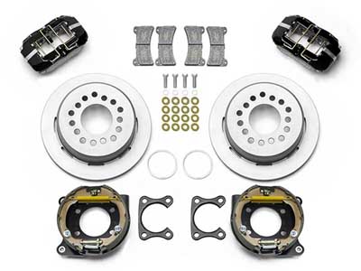 Wilwood Forged Dynapro Low-Profile Pro-Series rear disc brake kits provide a complete solution for popular muscle car rear axles on applications that require a parking brake assembly and extra clearance for 14-15" wheel size applications. Forged billet Dynapro Low-Profile four-piston calipers 11" one-piece hat and rotor assemblies, and high friction pads provide optimized and balanced braking for all types of custom performance street/strip and show machines. The neatly hidden internal shoe system provides a clean installation with superior static holding power for parking. Optional caliper finishes and rotor designs enable the builder to personalize the style and optimize brake performance for every individual application. Requires Wilwood Flexline Brake Lines, sold separately.