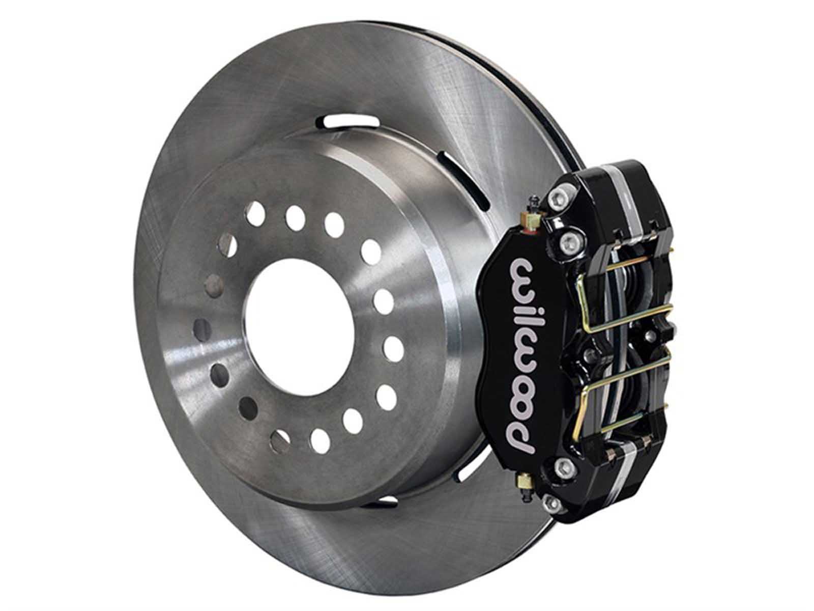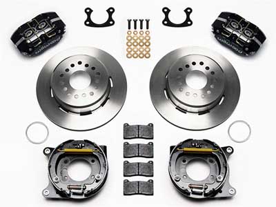 Wilwood Forged Dynapro Low-Profile Pro-Series rear disc brake kits provide a complete solution for popular muscle car rear axles on applications that require a parking brake assembly and extra clearance for 14-15" wheel size applications. Forged billet Dynapro Low-Profile four-piston calipers 11" one-piece hat and rotor assemblies, and high friction pads provide optimized and balanced braking for all types of custom performance street/strip and show machines. The neatly hidden internal shoe system provides a clean installation with superior static holding power for parking. Optional caliper finishes and rotor designs enable the builder to personalize the style and optimize brake performance for every individual application. Requires Wilwood Flexline Brake Lines, sold separately.
