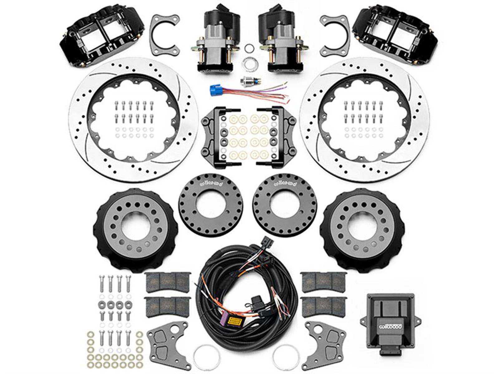 Wilwood Forged Narrow Superlite 4R Rear Electronic Parking Brake Big Brake Kits provide the ultimate Big Brake solution for popular muscle car rear axles that require a parking brake. FNSL4R four-piston calipers, two-piece rotors, and high performance BP-10 compound pads provide optimized and balanced braking to compliment front big brake upgrades on all types of custom, show and high performance street machines. The unique Electronic Parking Brake caliper provides a static high torque static holding power for parking without mechanical cabling. Supplied with control unit and harness assembly, it simplifies installation and use. Optional caliper finishes and rotor designs enable the builder to personalize the style and optimize brake performance for every individual application. Requires Wilwood Flexline Brake Lines, sold separately.