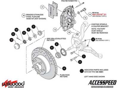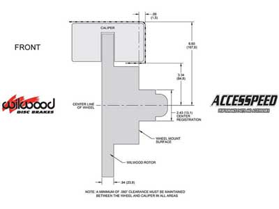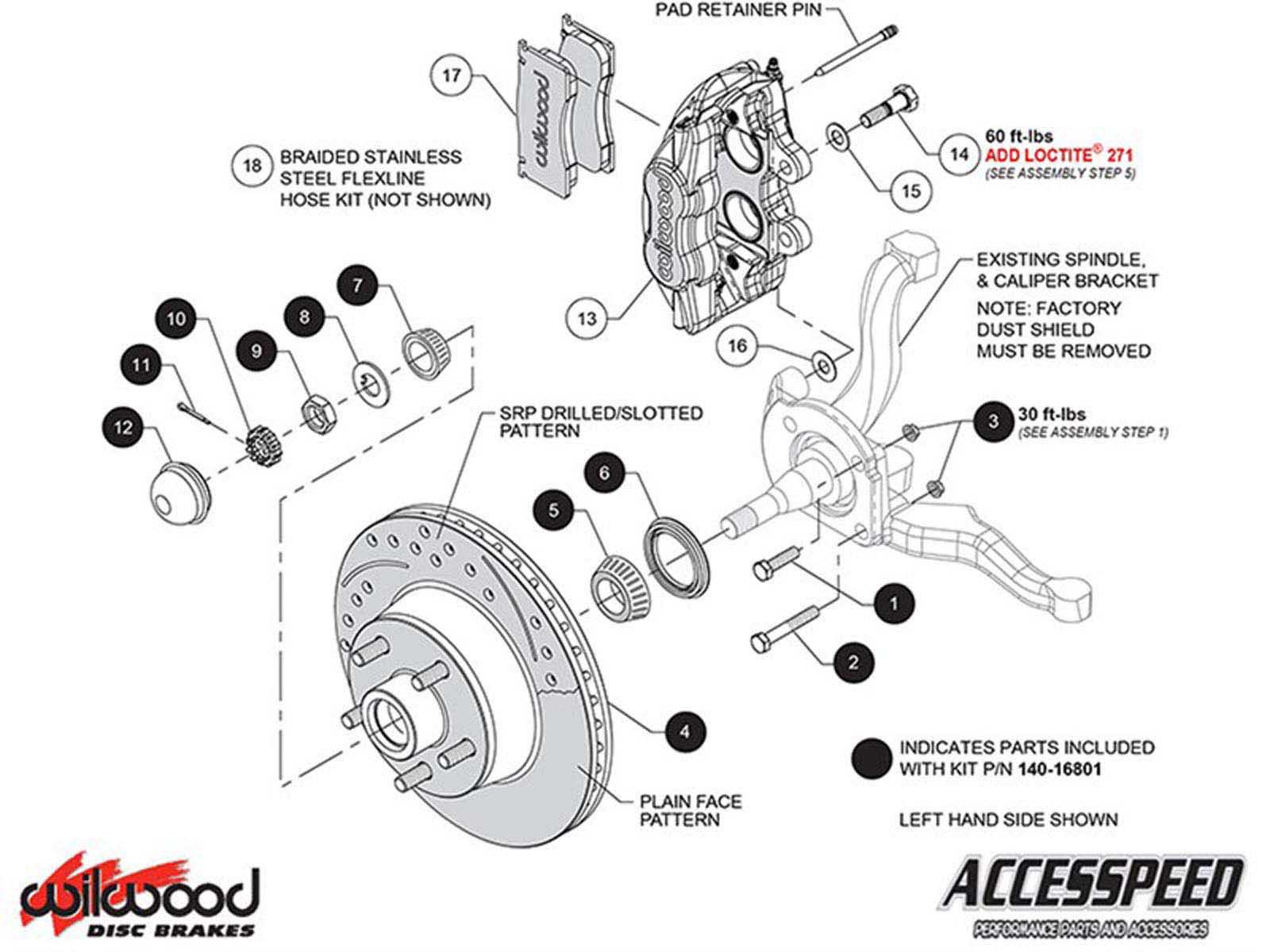 The Wilwood D11 Front Replacement Caliper Upgrade Kit is a cost-effective upgrade for those who do not want a complete big brake kit. Wilwood's D11 four-piston calipers are a direct bolt-on replacement for the original equipment Kelsey-Hayes calipers on all 1965-1967 Ford Mustang, Fairlane, Ranchero, Falcon, Comet, and Mercury Cougar vehicles, and offers great braking performance. Forged billet aluminum bodies, internal fluid crossover, stainless steel pistons, and high-temperature seals put an end to the rust, leaking, bore pitting and seal failures that plague the OE caliper design. Accesspeed offers these kits with the D11 calipers, DOT compliant stainless braided brake lines, and Promatrix performance compound brake pads. Wilwood D11 calipers can use factory-style brake pads, and they fit in stock location with original brackets and rotors.