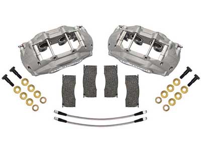 The Wilwood D11 Front Replacement Caliper Upgrade Kit from Accesspeed is a cost-effective upgrade for those who do not want a complete big brake kit. Wilwood's D11 four-piston calipers are a direct bolt-on replacement for the original equipment Kelsey-Hayes calipers on all 1965-1967 Ford Mustang, Fairlane, Ranchero, Falcon, Comet, and Mercury Cougar vehicles, and offers great braking performance. Forged billet aluminum bodies, internal fluid crossover, stainless steel pistons, and high-temperature seals put an end to the rust, leaking, bore pitting and seal failures that plague the OE caliper design. Accesspeed offers these kits with the D11 calipers, DOT compliant stainless braided brake lines, and Promatrix performance compound brake pads. Wilwood D11 calipers can use factory-style brake pads, and they fit in stock location with original brackets and rotors.