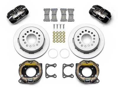 Forged Dynapro Low-Profile Pro-Series rear disc brake kits provide a complete solution for popular muscle car rear axles on applications that require a parking brake assembly and extra clearance for 14.00” to 15.00” rim applications. Forged billet Dynapro Low-Profile four-piston calipers 11.00” one-piece hat and rotor assemblies, and high friction pads provide optimized and balanced braking for all types of custom performance street/strip and show machines. The neatly hidden internal shoe system provides a clean installation with superior static holding power for parking. Optional caliper finishes and rotor designs enable the builder to personalize the style and optimize brake performance for every individual application. Fits BOP 2.75" Offset Staggered Rear End.
