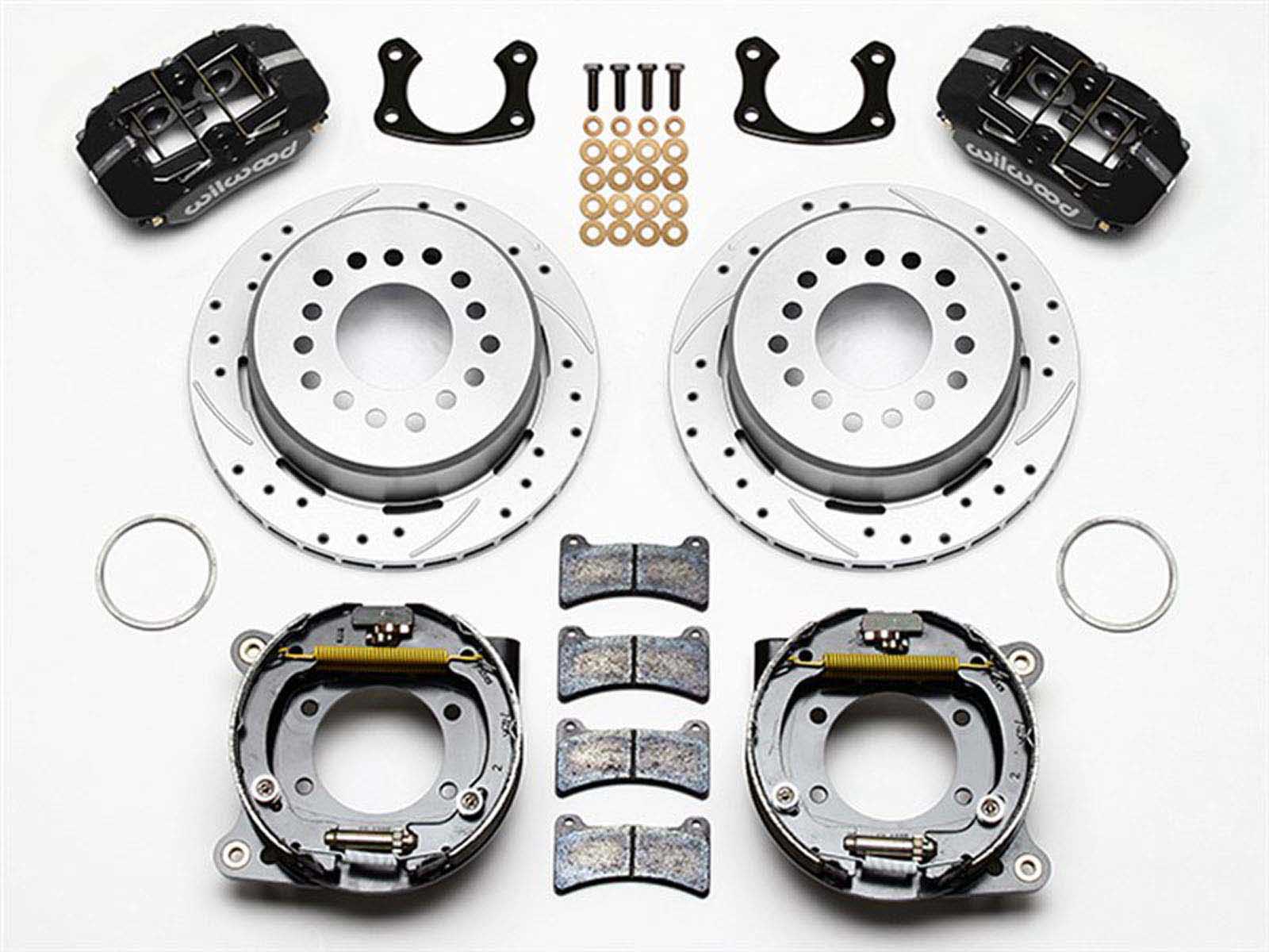 Wilwood’s Forged Dynalite Pro-Series rear disc big brake kits provide a complete solution for popular muscle car rear axles that require a parking brake. Forged billet Dynalite four piston calipers, 12.19" one-piece drum/rotors, and high friction pads provide optimized and balanced braking for all types of custom performance street/strip and show machines. The neatly hidden internal shoe system provides a clean installation with superior static holding power for parking. Optional caliper finishes and rotor designs enable the builder to personalize the style and optimize brake performance for every individual application. Requires Wilwood Flexline Brake Lines, sold separately.