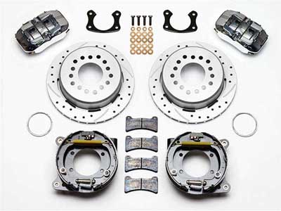 Wilwood’s Forged Dynalite Pro-Series rear disc big brake kits provide a complete solution for popular muscle car rear axles that require a parking brake. Forged billet Dynalite four piston calipers, 12.19" one-piece drum/rotors, and high friction pads provide optimized and balanced braking for all types of custom performance street/strip and show machines. The neatly hidden internal shoe system provides a clean installation with superior static holding power for parking. Optional caliper finishes and rotor designs enable the builder to personalize the style and optimize brake performance for every individual application. Requires Wilwood Flexline Brake Lines, sold separately.